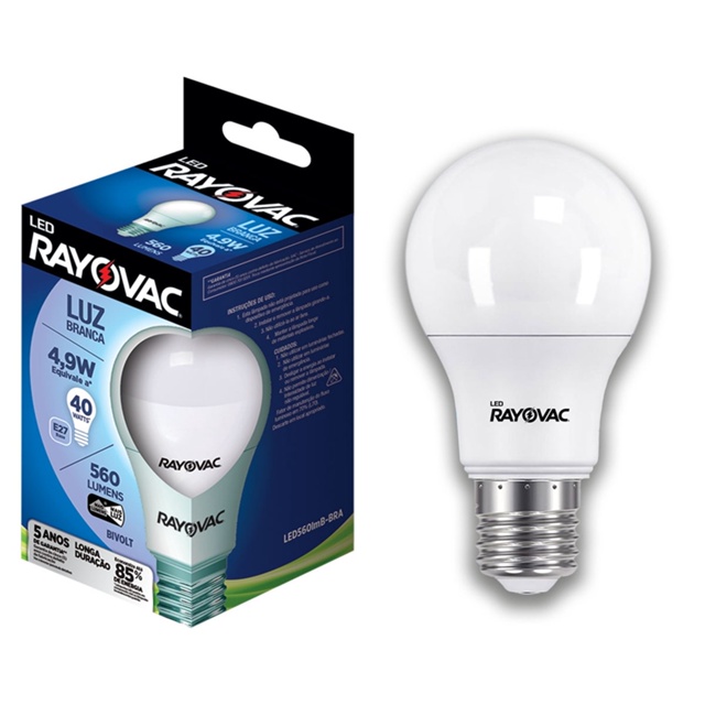 INFORMAÇÕES GERAIS: Contém: 1 Lâmpada Led 4,9W Tipo: Led Luz Branca APLICAÇÃO: Residências Hotéis Restaurantes Cafés Áreas comuns e Escritórios Equivale a 40W, 560 lúmens, acende de imediato, economia de até 85% de energia, 5 anos de garantia. As Leds Rayovac tem certificado de qualidade do INMETRO. CÓDIGO: LED560LMB-BRA