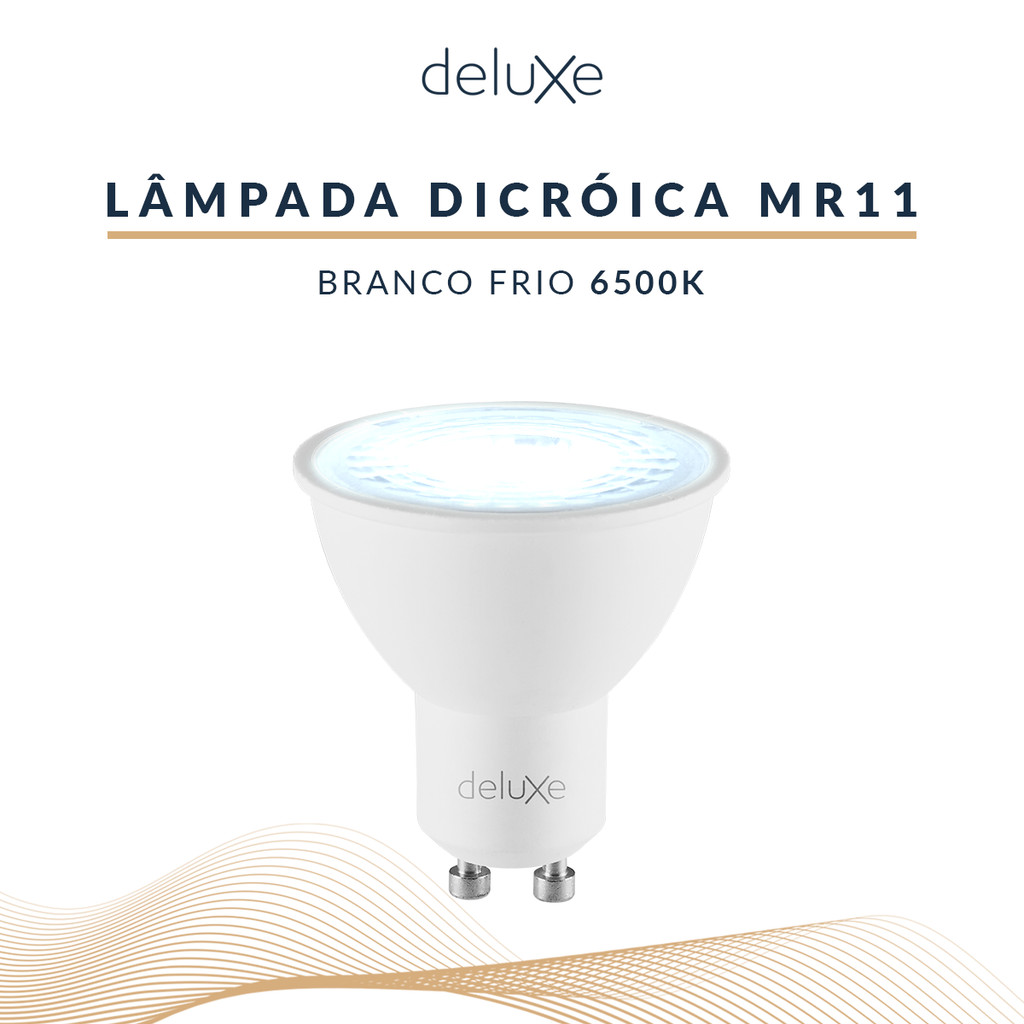 Lâmpada LED Dicróica MR11 4W GU10 6500K Ilumine seus espaços com tecnologia LED avançada com um design compacto, ideal para spots, vitrines e projetos de iluminação focal. A luz branca fria (6500K) proporciona clareza e um ambiente moderno, perfeito para áreas de trabalho, cozinhas ou onde a visibilidade nítida é essencial. PROPRIEDADES: Tecnologia LED: Garante alta eficiência energética, baixo consumo e longa vida útil. Formato MR11: Dimensões compactas, perfeitas para luminárias menores ou que exigem uma fonte de luz discreta. Potência de 4W: Iluminação eficiente com consumo reduzido de energia. Temperatura de Cor 6500K: Emite uma luz Branca Fria, estimulante e ideal para ambientes que requerem atenção e foco. Base GU10: Conexão prática e segura, compatível com a maioria dos spots e luminárias direcionáveis do mercado. CARACTERÍSTICAS DE FUNCIONAMENTO: Economia de Energia: Substitui lâmpadas halógenas dicróicas com consumo muito superior, gerando economia na conta de luz. Durabilidade: Vida útil prolongada, diminuindo a necessidade de substituições frequentes. Não Emite Calor no Facho de Luz (IR): Ideal para iluminar objetos sensíveis ao calor. Não Emite Radiação UV: Não desbota cores de objetos, tecidos ou obras de arte. ESPECIFICAÇÕES TÉCNICAS E COMERCIAIS: Código do Item: 919031373 Tipo: Lâmpada LED Dicróica Modelo: MR11 Potência Nominal: 4W Temperatura de Cor: 6500K (Branca Fria) Base (Soquete): GU10 Tensão Nominal: Bivolt Automático (100V-240V) Índice de Reprodução de Cor (IRC): >80 Garantia: Este produto conta com a Garantia Oficial da marca Deluxe By Avant de 12 meses, cobrindo eventuais defeitos de fabricação a partir da data da compra. Sobre a Marca Deluxe By Avant: A linha Deluxe By Avant representa o compromisso da Avant com a excelência em iluminação. Combinando design sofisticado, tecnologia de ponta e materiais de alta qualidade.