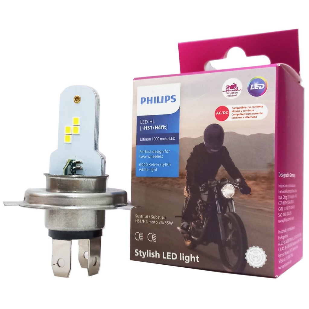 Conteúdo da Embalagem: Lâmpada Philips LED H4/HS1 6000K Moto 12V 4w (uso exclusivo em motocicletas) * Luz Branca 6000K C/ 100% + Mais Visibilidade * É uma ótima opção para quem busca uma iluminação mais potente e eficiente para a sua motocicleta. Ela é fabricada com a tecnologia Ultinon, que oferece um desempenho superior em comparação com as lâmpadas halógenas tradicionais. A Lâmpada Philips oferece uma luz branca e brilhante, que proporciona uma melhor visibilidade na estrada. Ela também é mais eficiente em termos de consumo de energia, o que pode ajudar a economizar combustível. Compatível com: Motos com o encaixe HS1 / H4 Por Exemplo: Cg 150 Titan / Fan / Start Factor , Fazer 150 , 125 Especificações Técnicas: - Tecnologia: Halógena; - Linha / Modelo: Ultinon 1000 Moto Led - Marca: PHILIPS - Encaixe H4/HS1; - Voltagem: 12V; - Potência nominal: 4W ; - Temperatura de cor: 6000k (Super Branca) - Instalação: Plug & Play; Vantagens: - Luz branca e brilhante - Maior eficiência em termos de consumo de energia - Design compacto e fácil de instalar IMPORTANTE: Recomendamos fortemente que a instalação seja feita por profissional especializado e não nos responsabilizamos pelo mau uso do produto; - Desligar o veículo; - Manusear a lâmpada pelo soquete.