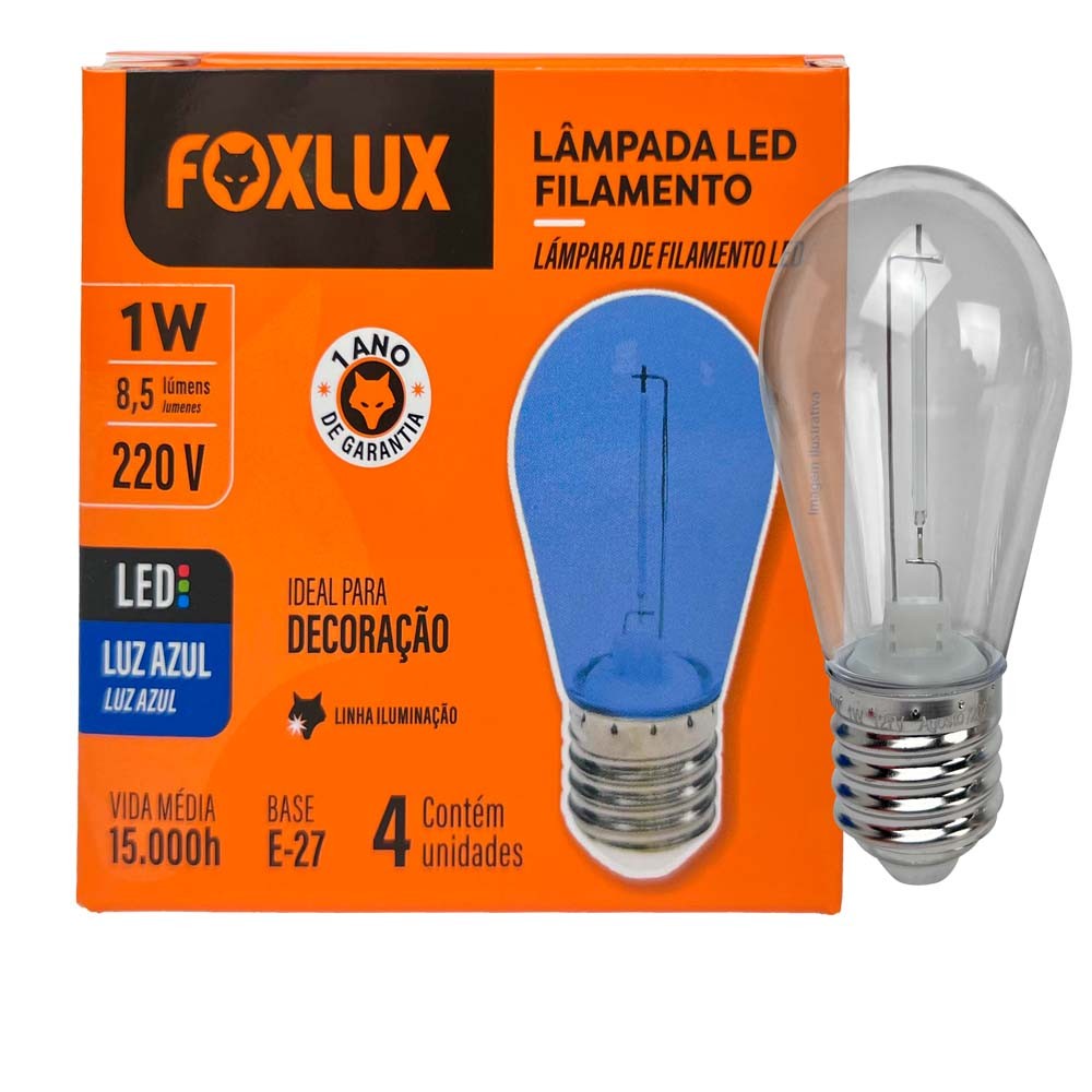 Lâmpada Led Foxlux Filamento Azul 1W E-27 220V 4Un | efeito decorativo, baixo consumo