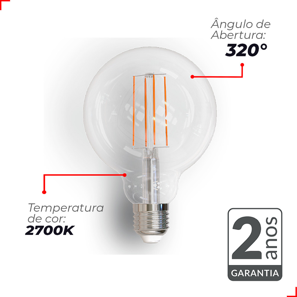 Ilumine sua casa com o charme atemporal das lâmpadas Globo Filamento. Dica de Uso: Combine as lâmpadas Globo Filamento com abajures, pendentes ou luminárias para criar um ambiente único e cheio de estilo. • PROPRIEDADES Material: Base em alumínio e bulbo em vidro • CARACTERÍSTICAS DE FUNCIONAMENTO - Tensão nominal: 100V - 240V Bivolt Automático - Potência nominal: 9W (G95 e G125) ou 15W (G200) - Fator de Potência: >0,70 - Frequência: 50-60Hz - Eficiência Luminosa: 100 lm/W • ESPECIFICAÇÕES TÉCNICAS E COMERCIAIS - CÓDIGO: 353250378 - DESCRIÇÃO COMERCIAL: LED-RETRO-IN-G95-CLEAR-E27-AM2700K-9W-BIVOLT - CÓDIGO DE BARRAS: 7899452037947 - MODELO: G95 - POTÊNCIA: 9W - FLUXO LUMINOSO: 900lm - TEMPERATURA DE COR: 2700K (Branco Quente) - PESO: 50g • Sobre a Garantia: 24 meses. Inicia-se na data da compra do produto, desde que sejam respeitadas as condições de uso descritas na embalagem, sendo necessário apresentar o Cupom ou a Nota Fiscal. • Sobre a Marca: A Deluxe by Avant é uma marca reconhecida por sua qualidade e inovação em iluminação, oferecendo produtos modernos e eficientes para diferentes necessidades.