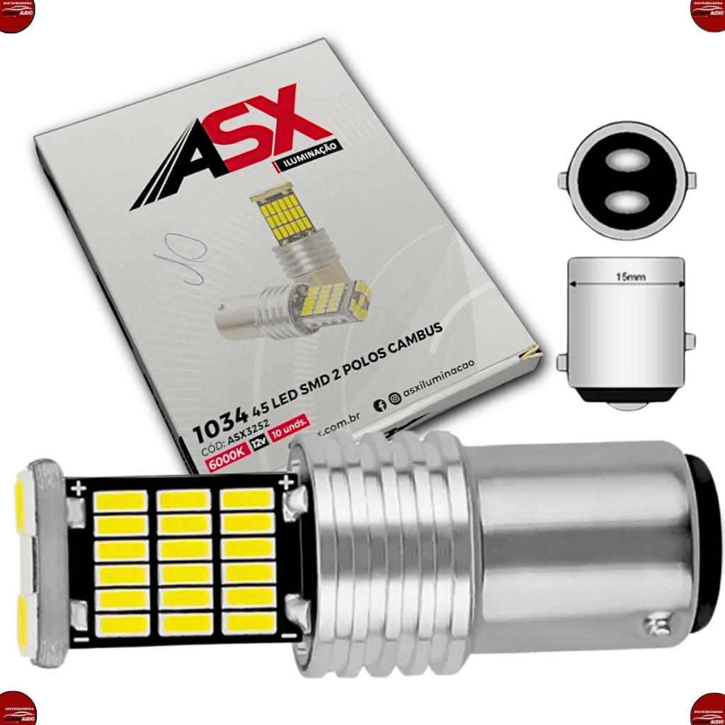 Lâmpada Automotiva 1034 2 Polos - Iluminação LED de Alta Performance para seu Veículo Ilumine seu caminho com a Lâmpada 1034 2 Polos da ASX, a escolha perfeita para quem busca alta performance, segurança e estilo em iluminação automotiva! Tecnologia e Eficiência: 45 LEDs SMD de alta qualidade: Proporcionam iluminação intensa e uniforme, garantindo excelente visibilidade em qualquer condição de condução. 6000K Branco Frio: Emite uma luz branca brilhante que melhora a visualização de placas, sinalizações e obstáculos, aumentando a segurança na estrada. 900 Lumens: Potência luminosa ideal para uma iluminação eficiente sem causar ofuscamento. Tecnologia CANBUS: Elimina erros no painel do veículo, garantindo compatibilidade com diversos modelos. Versatilidade para uso em carros, motos e caminhões. Durabilidade e Economia: 50.000 horas de vida útil: Longa durabilidade, reduzindo a necessidade de substituições frequentes. 5W de potência: Baixo consumo de energia, contribuindo para a economia de combustível. Corrente de 0.23A: Eficiência energética otimizada. Design e Praticidade: Encaixe P21 BAY15D: Fácil instalação e compatibilidade com diversos modelos de veículos. 2 Polos: Conexão segura e confiável. Marca ASX: Qualidade e confiabilidade em iluminação automotiva. Especificações Técnicas: Modelo: 1034 2 Polos LEDs: 45 SMD Cor: Branco Frio (6000K) Lúmens: 900 Voltagem: 12V Potência: 5W Corrente: 0.23A Encaixe: P21 BAY15D Vida Útil: 50.000 horas Marca: ASX Conteúdo da Embalagem: 2 Lâmpada 1034 2 Polos ASX Observações: Verifique a compatibilidade com o modelo do seu veículo antes da compra. A instalação da lâmpada deve ser realizada por um profissional qualificado.