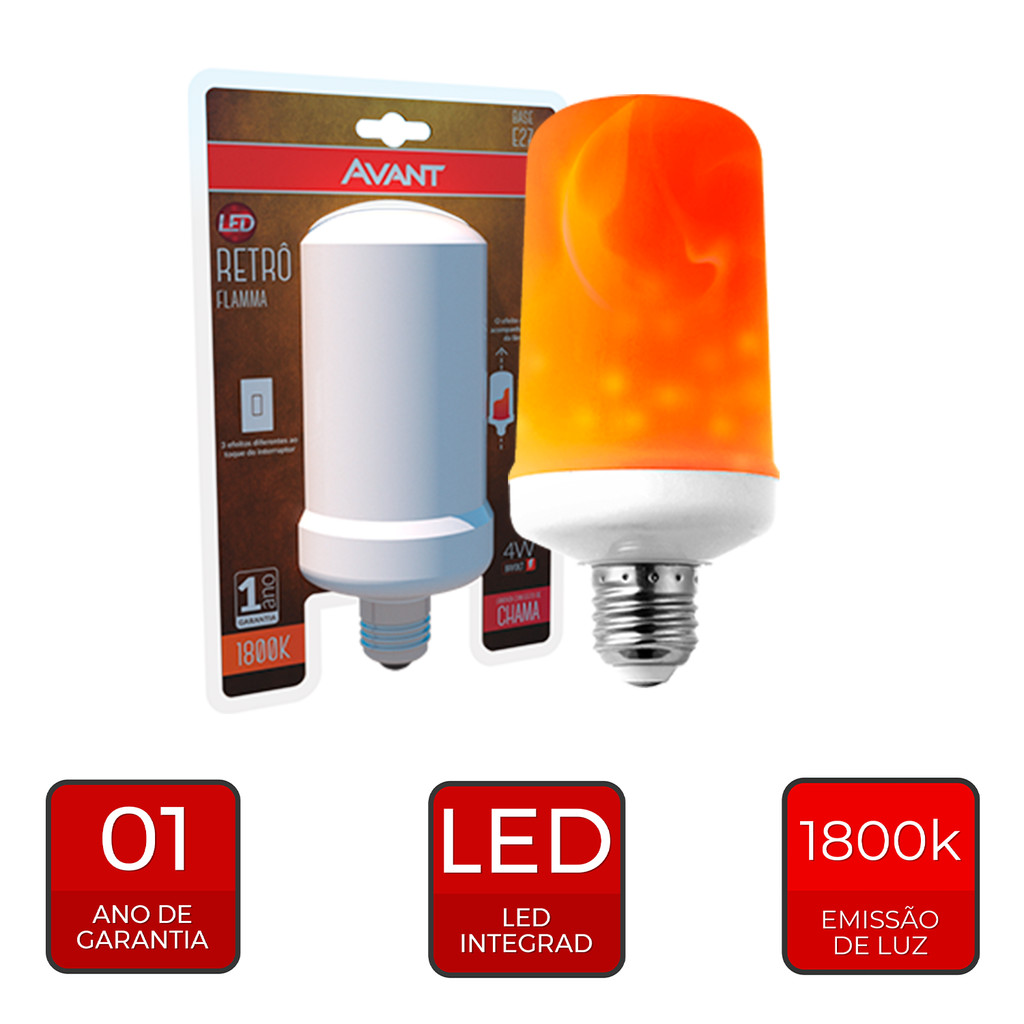 Lâmpada Flamma Propriedades: Bulbo e base em plástico, base em alumínio; Base E27. Características de Funcionamento: Temperatura ambiente: -5°C a 40°C; Tensão de entrada: 127V - 220V; Fator de potência: >0,50. Especificações Técnicas e Comerciais: Código: 860790077 Modelo: LED-RETRO-FLAMMA-E27-4W-BIVOLT Código de Barras: 7899452013873 Potência: 4W Base: E27 luxo Luminoso: 180 lm Eficiência Luminosa: 45 lm/W Peso: 55g Dimensões: Ø63mm x 142mm A Lâmpada Flamma possui garantia oficial da marca Avant de 12 meses para defeitos de fabricação, desde que respeitadas as condições de uso descritas na embalagem e mediante apresentação do cupom ou nota fiscal de compra. Sobre a Marca Avant: A Avant é reconhecida por oferecer soluções de iluminação inovadoras e de alta qualidade. Seus produtos combinam design moderno, eficiência energética e tecnologia avançada, proporcionando ambientes mais agradáveis e funcionais. A marca se destaca pelo compromisso com a satisfação do cliente e a durabilidade de seus produtos.