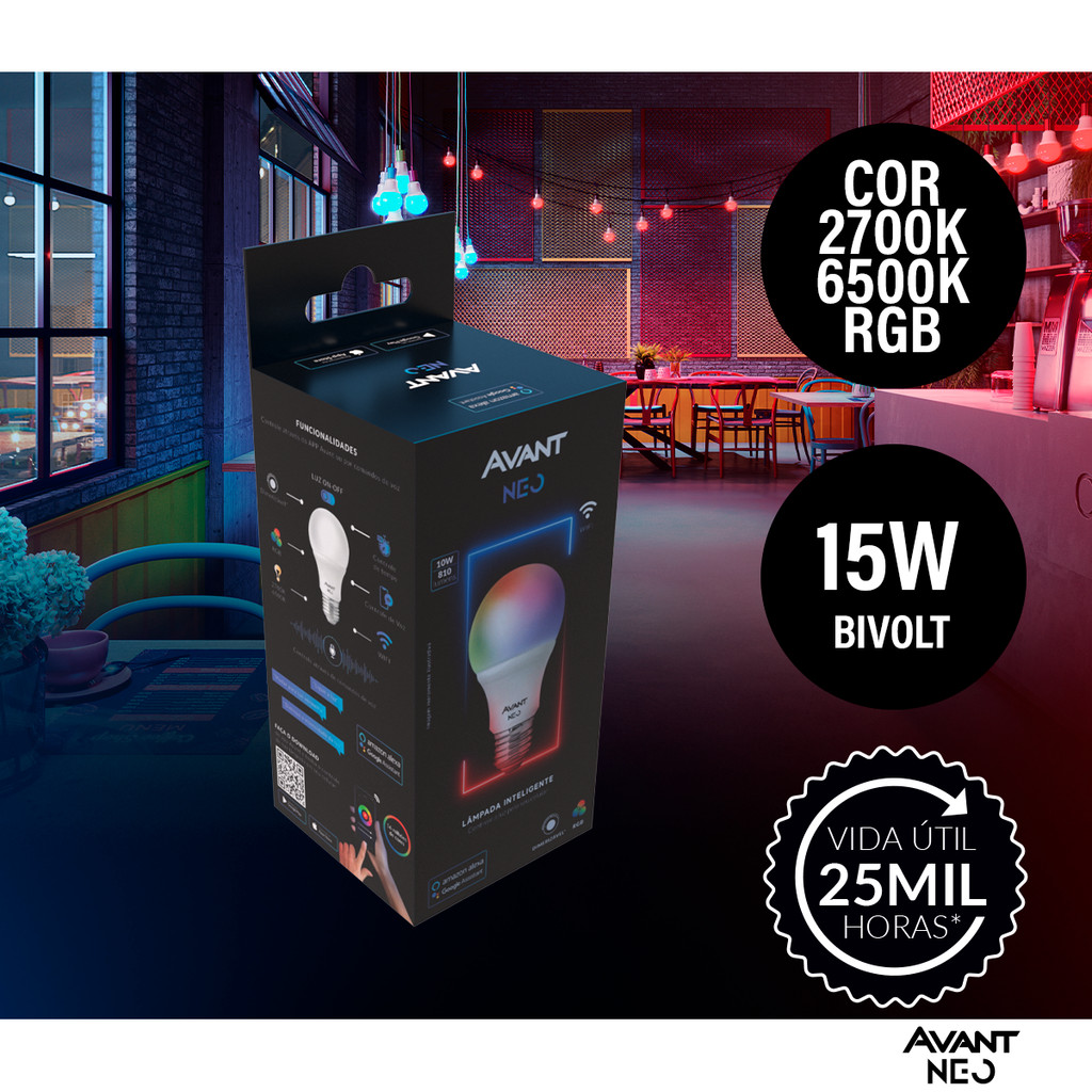 Lâmpada LED Smart Neo Avant RGB - Ilumine seu Mundo com Cores! A Lâmpada LED Smart Neo Avant RGB é a escolha ideal para quem busca uma iluminação inteligente, versátil e com um toque de cor. Com tecnologia Wi-Fi, você controla a temperatura de cor de 2.700K a 6.500K, além de ter acesso a mais de 16 milhões de cores para criar o ambiente perfeito para qualquer ocasião. PROPRIEDADES: Iluminação inteligente: Controle total da iluminação através do app Avant ou comandos de voz com Amazon Alexa e Google Assistente. Personalização: Ajuste a temperatura de cor e escolha entre milhões de cores para criar a atmosfera ideal para cada momento. Eficiência energética: Economia de energia em comparação com lâmpadas tradicionais. Durabilidade: Vida útil de até 25.000 horas. Compatível com diversos ambientes: Ideal para quartos, salas, cozinhas, escritórios e outros ambientes internos. CARACTERÍSTICAS DE FUNCIONAMENTO: Rede Wi-Fi: Frequência de 2.4 GHz. Bivolt automático: Funciona em 100V - 240V. IP20: Indicado para ambientes internos. ESPECIFICAÇÕES TÉCNICAS E COMERCIAIS (Item 290048238): Código: 290048238 Descrição Comercial: LED-PER-NEO-AM2700K-BR6500K-RGB-15W-BIVOLT Código de Barras: 7899452028785 Emissão de Luz: RGB Fluxo Luminoso: 1200 lm GARANTIA: A Lâmpada LED Smart Neo Avant RGB possui garantia oficial Avant de 12 meses para defeitos de fabricação. SOBRE A MARCA AVANT: A Avant é uma marca líder em soluções de iluminação, com foco na inovação e na busca constante por produtos de alta qualidade e tecnologia de ponta. A Avant se destaca por oferecer produtos inteligentes que facilitam o dia a dia e proporcionam mais conforto e praticidade aos seus clientes.