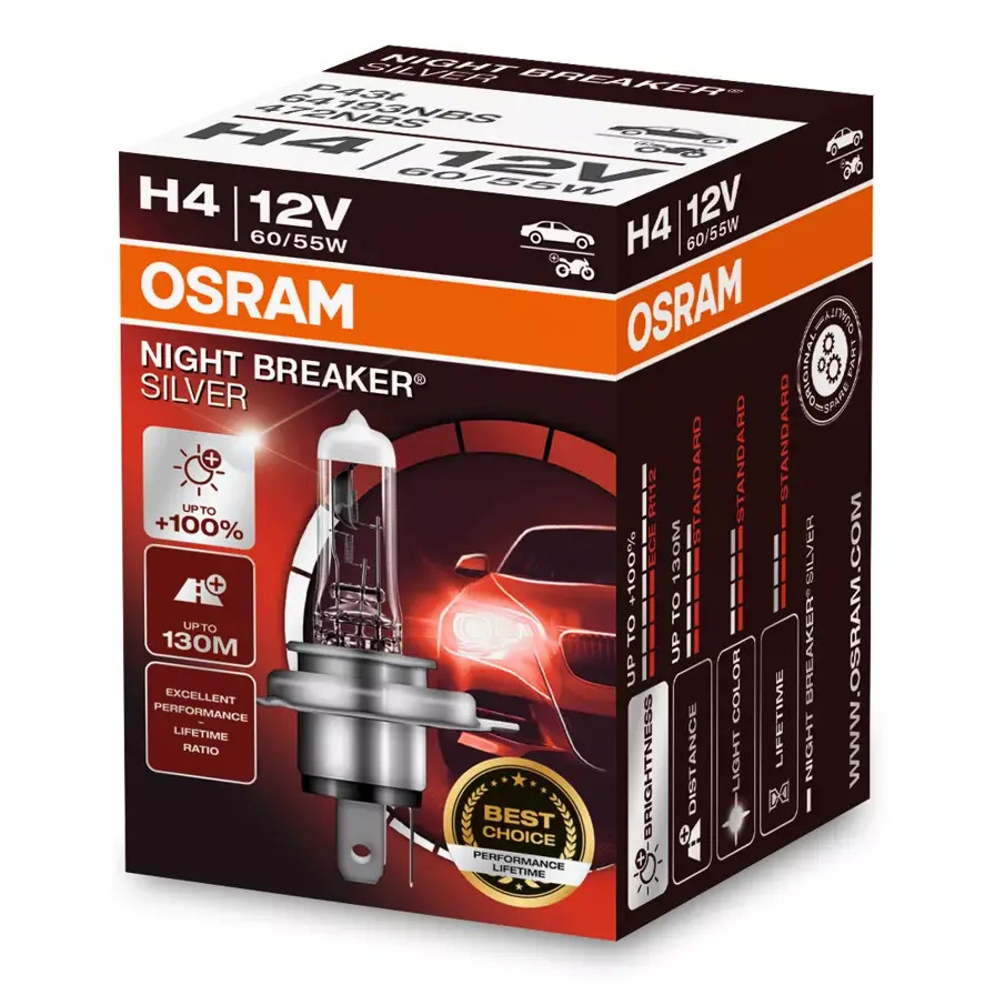 Lâmpada Osram Night Breaker Silver H4 +100% 3200K 12V Com a NIGHT BREAKER SILVER, a OSRAM oferece uma lâmpada automotiva halógena de alto desempenho com vida útil otimizada, gerando até 100% mais brilho em comparação com o padrão, isso permite que o condutor veja sinais de trânsito, obstáculos e perigos mais cedo, tendo assim mais tempo para reagir. Além do design moderno com uma atraente tampa prateada. A escolha perfeita para condutores com altas exigências de desempenho e vida útil. Produto para Carro e Moto ESPECIFICAÇÕES TÉCNICAS: - Tecnologia: Halógena; - Linha / Modelo: Night Breaker Silver; - Marca: Osram; - Encaixe H4; - Voltagem: 12V; - Potência nominal: 55/60W; - Temperatura de cor: 3200K; - Fluxo Luminoso: 1650/1000; - Soquete (base): P43t; - Vida Útil B3: 250hrs / 400hrs - Vida Útil TC: 500hrs / 900hrs - Código do Produto: 64193NBS; - Lâmpada certificada pelo Inmetro: Sim. CONTÉUDO DA EMBALAGEM: - 1 Lâmpada Osram Night Breaker Silver H4. INSTALAÇÃO: - Recomendamos fortemente que a instalação seja feita por profissional especializado e não nos responsabilizamos pelo mau uso do produto; - Uso de EPI. (Equipamento de proteção individual); - Desligar o veículo; - Manusear a lâmpada pelo soquete. IMPORTANTE: - Garantia: 90 dias contra qualquer defeito de fabricação; - Imagens Meramente Ilustrativas; - Todos os nossos produtos são originais de fábrica. OBSERVAÇÕES: - Vida Útil B3: indica o tempo que 3% das lâmpadas testadas apresentaram falhas; - Vida Útil TC: indica o tempo que 63,2% das lâmpadas testadas apresentaram falhas.
