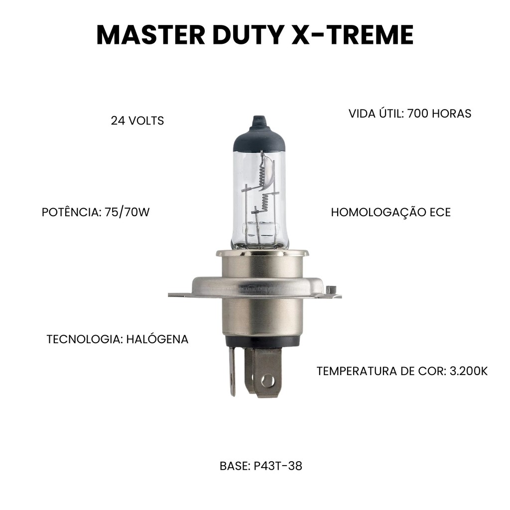 AS LÂMPADAS PARA FAROL PHILIPS MASTERDUTY XV SÃO PROJETADAS PARA RESISTÊNCIA MÁXIMA À VIBRAÇÃO E EXCELENTE VIDA ÚTIL. ELAS FORNECEM LUZ ATÉ 130% MAIS BRILHANTE. PHILIPS MASTERDUTY É A ESCOLHA CERTA PARA MOTORISTAS QUE BUSCAM RESISTÊNCIA DURADOURA. * FEITO PARA DURAR * RESISTÊNCIA MÁXIMA À VIBRAÇÃO ESPECIFICAÇÕES: - APLICAÇÃO: * FAROL ALTO * FAROL BAIXO * FAROL NEBLINA - BASE: P43T-38 - DESIGNAÇÃO: 13342MDXVC1 - HOMOLOGAÇÃO ECE: SIM - LINHA: MASTER DUTY X-TREME VISION - TECNOLOGIA: HALÓGENA - TIPO: H4 - VIDA ÚTIL: 700 HORAS - TEMPERATURA DE COR: 3200K - POTÊNCIA: 75/70W - VOLTAGEM: 24 VOLT GARANTIA DE 3 MESES DIRETO COM O FABRICANTE