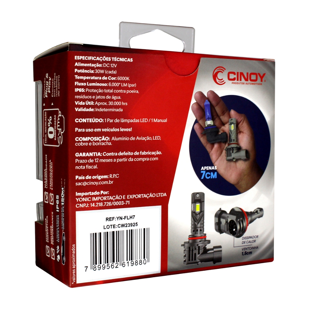 Lâmpada Super Led Cinoy Plus 6500k + Canceller A Lâmpada LED Cinoy Super Plus oferece uma experiência de direção mais segura e agradável, combinando alta luminosidade, design compacto e tecnologia inovadora. ESPECIFICAÇÕES: - Conector H7 - Conexão Plug & play - Luz super branca - Longa vida útil - Eficiência energética - Alto fluxo luminoso - Design compacto - Resfriamento eficiente - Proteção contra intempéries - Temperatura de cor: 6.500K - Voltagem: 12V e 24V - Quantidade de LEDs: 6 por Lâmpada - Vida Útil de Até 30 Mil Horas CONTEÚDO DA EMBALAGEM: 1 par de Lâmpadas LED Cinoy Super Plus 1 Manual de instalação REATOR: Apesar de não estar visível nas fotos todos os modelos desse anuncio possuem reator. ERRO NO PAINEL? O modelo desse anuncio não possui cambus, em 95% dos carros não acusa erro, caso acuse basta usar um canceller. Só é possível dizer se será necessário o uso do canceller após a instalação. CONECTOR: Todos os modelos vão com os conectores, 100% Plug and play, basta conectar.