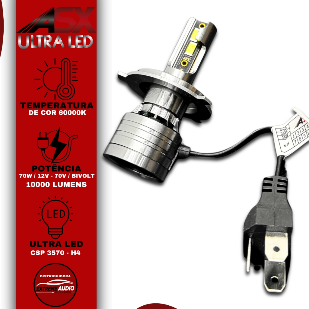 Ultra led ASX Canbus 70W 10.000 Lúmens - Lançamento 2023 - Novo Ultra Led ASX com Chip modelo Csp 3570 de 10.000 Lúmens - Led com canbus (não acusa lâmpada queimada na maioria dos veículos) nos consulte se é realmente compatível ao seu carro - CERTIFIQUE SE REALMENTE O SEU CARRO É COMPATÍVEL COM ESSE TIPO DE LED - Tamanho da lâmpada LED é 7,5cm, sendo que, 3,5cm é da parte do dissipador e 4,0cm do a parte do comprimento onde fica os pontos do LED. Com essas medidas, veja se atende ao seu carro. Modelos Disponíveis: - H4 Especificações Técnicas: - Tecnologia ultra led CSP - Temperatura de cor 6.000k - Eficiência de 10.000 lúmens no par - Tonalidade branca - Potência 70 w - Voltagem 12v e 24v - Quantidade de 02 leds por lâmpada - Com cooler - Maior vida útil - Acabamento Galvanizado e cromado - Base da lâmpada em alumínio - Dissipador de calor em alumínio aviação - Sem drive externo, basta plugar - Despolarizado - Resistente a vibração - Nano design a prova d'água, nível de impermeabilidade IP65 Conteúdo da embalagem: - 02 lâmpadas ultra led com canbus Obs: - Antes de confirmar a compra, confira se o modelo escolhido é compatível com seu carro. Importante: - Valor unitário - Imagens meramente ilustrativas - Garantia de fábrica com duração de 3 meses - Recomendamos que a instalação seja feita por um profissional, e não nos responsabilizamos pelo mau uso do produto.