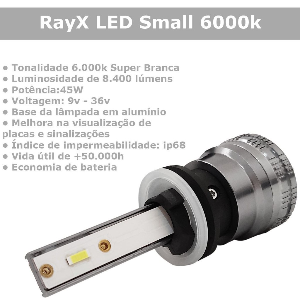 LÂMPADA ULTRA LED SMALL - RAYX - 12V E 24V - 6000K - 8400LM Lâmpada led 45W com medidas reduzidas para facilitar a instalção DIFERENCIAIS • Tamanho reduzido, similar as lâmpadas originais • Alta potência • Acabamento sofisticado • Dissipador de calor composto por cobre • Maior resfriamento • Maior vida útil e eficiência Modelo LED SMALL de alta potência, inovador e compacto com acabamento sofisticado. Resistente a água e dissipador de calor composto por cobre, garante maior resfriamento, assim aumentando a vida útil e eficiência. ESPACIFICAÇÕES TÉCNICAS • Conectores disponíveis: H1 H3 H4 H7 H11 H27 HB3 HB4 (Escolha acima do botão comprar) • Tonalidade 6.000k Super Branca • Luminosidade de 8.400 lúmens • Potência:45W • Voltagem: 9v - 36v • Base de lâmpada em alumínio • Melhora na visualização de placas e sinalizações • Índice de impermeabilidade: ip68 • Vida útil de +50.000h • Economia de bateria ITENS INCLUSOS • 01 Par de Led RayX Small • 01 manual do proprietário