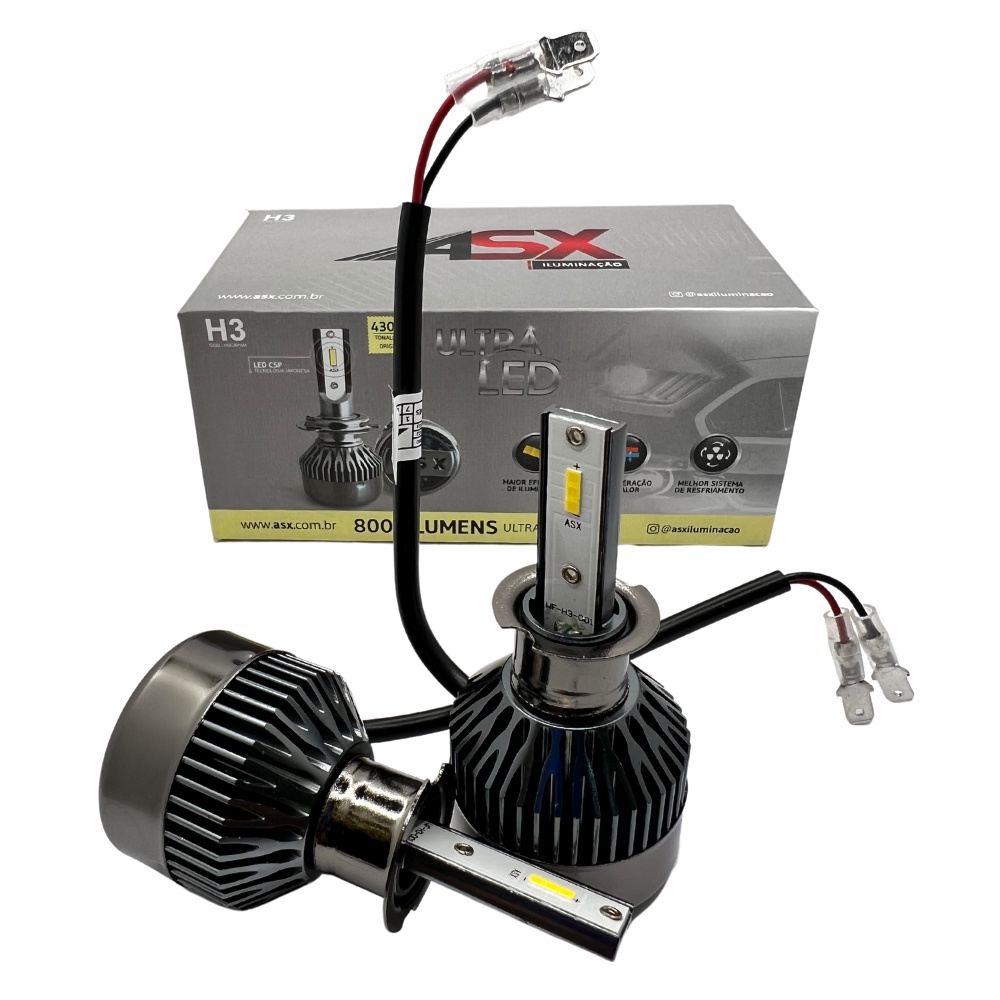Alem de proporcionar um estilo, melhora a visibilidade do motorista, trazendo mais seguranca e conforto na conducao, a tonalidade branco neutro, e eficiente para melhorar a visualizacao de placas e sinalizacoes. Esse kit de lampadas e extremamente eficiente e inovador no mercado atual, pois consegue oferecer a qualidade e eficiencia do xenon utilizando a tecnologia japonesa de ULTRA LED CHIP CSP, com maior eficiencia de iluminacao baixa geracao de calor e melhor sistema de resfriamento. Esse modelo de lampadas possui tonalidade de 4300k e baixo consumo, pode ser utilizado em carro de 12/24 volts com garantia de vida util prolongada. Lampadas com ate tres vezes mais potencia e foco mais nitido que os leds convencionais. O ULTRA LED CSP ASX tem todos os componentes embutidos, sem qualquer outra parte para ocupar espaco e dificultar a instalacao no farol. Especificacao Tecnica: - Marca: ASX - Conector: H3 - Tecnologia Japonesa: Ultra LED CSP - Sistema de dissipacao: Dissipador e Cooler - Taxa impermeavel: IP68 (resistente a agua) - Base de Lampada: Em Aluminio - Eficiencia de LM: 8000 Lumens - Vida Util de: 30000 Horas - Angulo de irritacao: 360 graus - Temperatura de Trabalho: -40 ? C ~ 105 ? C - Consumo: 70W - Voltagem: BIVOLT - Voltagem: DC 9 ~32V - Cor de Temperatura : 4300k branco neutro - Mesma cor da lampada original do carro. Conteudo da Embalagem: - 1 PAR ULTRA LED HEADLIGHT H3 (FAROL DE LED) COM COOLER 70W/8000LUMENS Importante: - Valor unitario - Imagens meramente ilustrativas - Garantia de fabrica com duracao de 3 meses - Recomendamos que a instalacao seja feita por um profissional, e nao nos responsabilizamos pelo mau uso do produto.