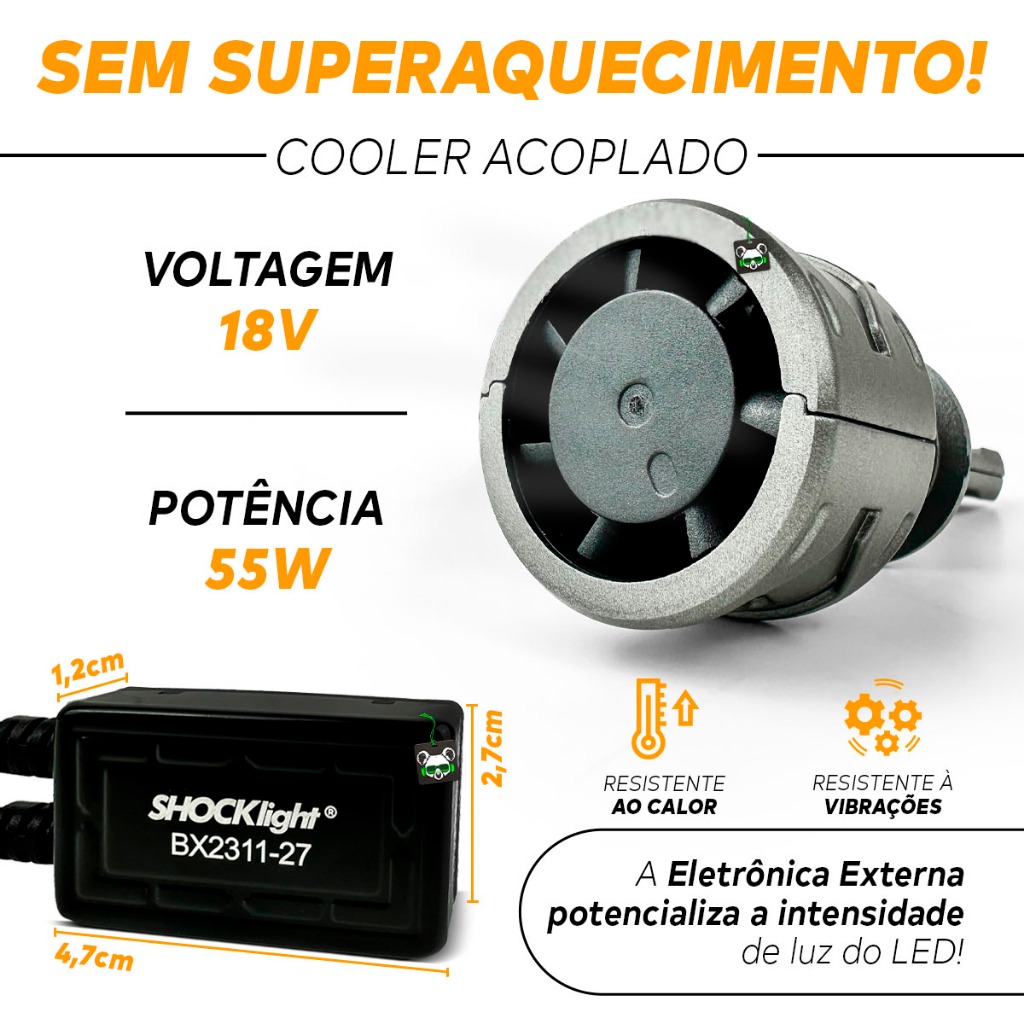Bem-vindo a Koala Parts! A sua escolha certa para peças e acessórios automotivos - Há mais de 10 anos oferecendo qualidade e confiança. Lâmpada Ultraled Shocklight S17X 5500 Lúmens 6500K H3 OBS! Recomendamos que verifique o encaixe compatível com o seu veículo no manual antes de realizar a compra. MUITA TECNOLOGIA E DESIGN PREMIUM COM A ULTRALED S17X QUE DISPENSA USO DE CANCELLER Investimento inteligente na sua segurança e no seu conforto ao dirigir. • 5.500 LÚMENS CADA (11.000 MIL O PAR) • DISPENSA USO DE CANCELLER • LUZ BRANCA FRIA DE 6500K • SISTEMA DE REFRIGERAÇÃO COM COOLER INTERNO • A PROVA D'ÁGUA • ALTA DURABILIDADE CHIP LED DE ALTA QUALIDADE Produz luz intensa e duradoura, com vida útil de até 30.000 horas. ELETRÔNICA EXTERNA Amplifica a intensidade da luz, proporcionando um facho de luz até 200% mais forte do que as lâmpadas halógenas tradicionais. REFRIGERAÇÃO EFICIENTE Sistema de dissipação de calor garante o funcionamento ideal do LED, mesmo em uso prolongado. FACÍL INSTALAÇÃO Basta substituir a lâmpada antiga pela Ultraled S17X e aproveitar uma iluminação mais eficiente e segura. OBS! Recomendamos que verifique o encaixe compatível com o seu veículo no manual antes de realizar a compra. ESPECIFICAÇÕES TÉCNICAS: - Encaixe: H3 - Temperatura da cor: 6500K - Lúmens: 5500L (11.000 o Par) - Resistente ao calor e vibrações - Despolarizado - À prova D'água - Com Cooler interno - Dispensa o uso de Canceller - Modelo: S17X - Voltagem Operacional: DC9-18V - Potência: 55W - Código IP: IP65 - Dissipação de Calor teórico: Alumínio de Aviação 6063 - Vida Útil: 30.000hrs - Temperatura Operacional: 40°C~+80°C CONTEÚDO DA EMBALAGEM: - Par de Lâmpadas Ultraled S17X H3 Recomendamos que a instalação seja feita por um profissional; Não nos responsabilizamos pelo mal uso do produto