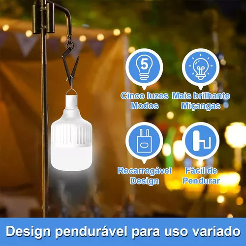 Lâmpadas Led Bulbo 80w 100w e 150w Branco Frio Recarregável para Emergência- Iluminação Externa Confiável Distribuição uniforme de luz: experimente ambientes consistentes e suavemente iluminados com esta lâmpada de carregamento robusta, projetada para ser suave para seus olhos. Uso eficiente de energia: obtenha notáveis iluminação com apenas de carregamento USB. Economize energia e desfrute de desempenho duradouro. Recarga sob demanda: carregue esta lâmpada de emergência sempre que necessário, garantindo luz ininterrupta e iluminante por muitos anos. Brilho portátil: carregue esta lanterna LED ajustável sem esforço e nunca mais se preocupe com substituições de bateria. Conveniência no seu melhor. Aprimoramento ao ar livre: Com sua saída de 80/100/150 W, esta lâmpada LED ajustável eleva seus espaços ao ar livre, seja seu terraço, jardim, varanda, churrasqueira ou festa de aniversário. Ilumine seu mundo ao ar livre. Lâmpada De Emergência/Camping : Com a Luminária de Emergência/camping, você pode ter certeza de que sempre terá iluminação em situações de falta de luz ou nas suas aventuras em acampamentos. FÁCIL DE USAR: Com um botão liga/desliga e de seleção de modos, a Luminária de Emergência é fácil de usar. Carregamento via USB (acompanha cabo USB) GANCHO DE PENDURAR : Com o gancho integrado, você pode pendurar a luminária em qualquer lugar que precise de iluminação. Especificação: Material: ABS Cor da luz: branco Tensão: 5V Fonte de luz: LED Tempo de carregamento: 6-8 horas Tempo de utilização: cerca de 3-4 horas (a duração depende do modo de iluminação) Método de carregamento: USB Tipo de bateria: bateria de lítio, capacidade da bateria 2400 mAh Mecanismos de regulação: três níveis de luminosidade reguláveis 5 modos de funcionamento: luz forte, luz média, luz fraca, flash (SOS), flash lento