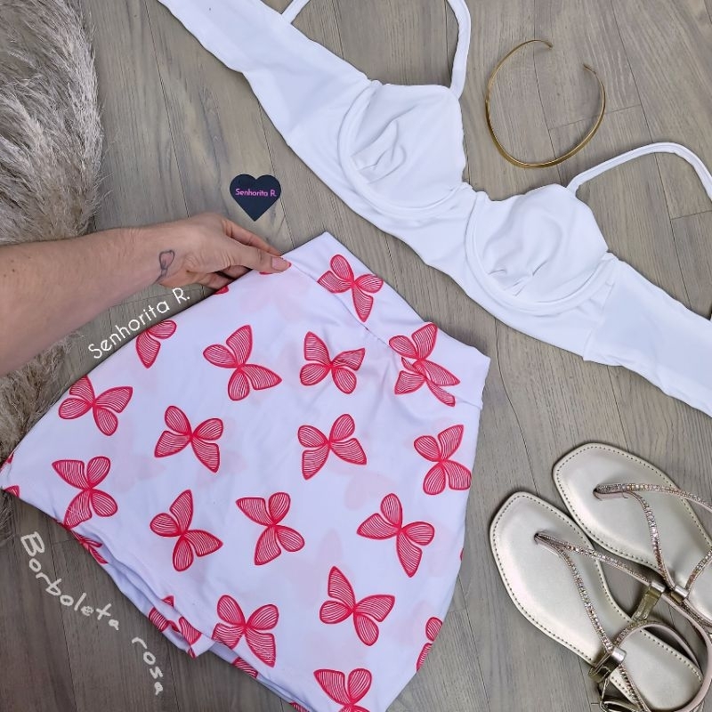 LANÇAMENTO Conjunto Short Saia Cropped Top Aro Estampado Estampa Borboletas Look Inspir