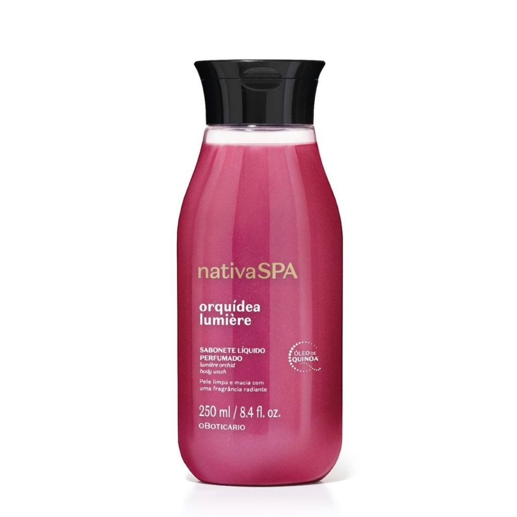 SOBRE A LINHA NATIVA SPA ORQUÍDEA LUMIÈRE Junte a intensidade da Orquídea com os encantos das agradáveis noites de verão, e você terá Nativa SPA Orquídea Lumiére, uma linha que te convida a irradiar o seu poder de conquista. Sua fragrância Floral Ambarado envolve seu corpo em uma intensa perfumação duradoura e promove uma pele ultra macia e radiante. Você merece todo esse brilho. Pele assim, é Nativa SPA. Nenhum produto o Boticário é testado em animais, ou seja, este item possui selo Cruelty Free. Produto vegano. *Bioéster 100% puro de quinoa. **Estudo in vitro em pele 3D do ingrediente bioéster de quinoa. ***Resultado obtido após 15 dias de uso do produto