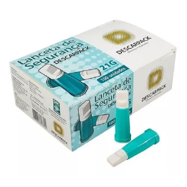 A Lanceta de Segurança Descartável Descarpack é um dispositivo perfurante e cortante com bisel trifacetado, desenvolvido para a punção superficial da pele a fim de obter amostras de sangue capilar para a realização de testes laboratoriais. O dispositivo possui um mecanismo de segurança de ação tipo mola, que mantém a agulha protegida no interior do produto, sendo acionada apenas após a pressão sobre a pele no momento do uso. Logo após a utilização, a agulha é retraída, evitando acidentes e contaminações. Características e Detalhes: * Fabricada em aço inoxidável e ABS; * Oferece conforto e segurança ao usuário e ao paciente; * Atende aos critérios de segurança da NR 32; * Atóxico e apirogênico; * Embalado individualmente em Papel Grau Cirúrgico; * Produto estéril, descartável e de uso único. Indicações de uso: A Lanceta de Segurança Descarpack é ideal para uso para a obtenção de amostras de sangue capilar, de maneira simples e segura, para uso em doseamentos laboratoriais. É destinada ao uso por profissionais da saúde em ambientes laboratoriais ou clínicas. Especificações do produto: Cartucho com 100 unidades Tamanho Cor Código 21 g Ciano 0600301 23 g Vermelho 0600401 28 g Azul 0600101