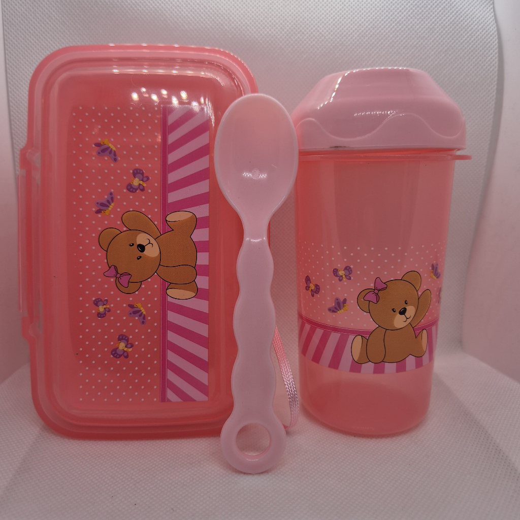 Kit Alimentação infantil Conteúdo: - 1 Marmita - 1 Colher - 1 Garrafa com alça -Matéria-prima: Polipropileno -MARMITA CAPACIDADE: 400ML -GARRAFA CAPACIDADE: 300ML