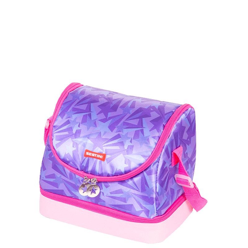 Os tons de lilás e rosa se destacam nesta coleção que vai brilhar! A lancheira especial tem dois compartimentos com revestimento resistente a líquidos e de fácil limpeza que também ajudam a organizar melhor o lanche e as refeições: no espaço inferior, cabem potes e porções de frutas, por exemplo. Já na abertura principal, mais ampla, podem ficar as garrafas e outros alimentos. Ela pode ser transportada com a alça transversal ajustável ou com a alça carona, que fixa no carrinho da mochilete. *Produto SESTINI certificado pelo INMETRO Registro: 003954/2013 - OCP - : 0061 Possui a Altura: 22 Cm - Largura: 22 Cm - Profundidade: 11 Cm - Peso: 0,2 KG - Capacidade Total: 5 L