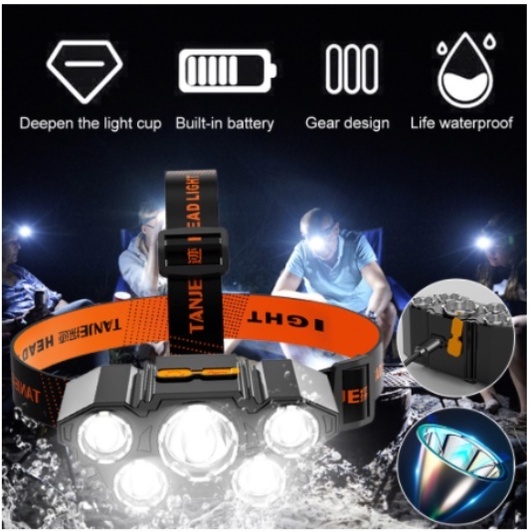aracterísticas: Cinco desenho da lâmpada Quatro modos de marcha 90° Ajuste Luz super longe Bateria longa duração Alcance: 350-1000m Luz principal: 15-20h Lumens: 500 lúmens (cada luz led) Método de carregamento: Carregamento usb Android Tomada de computador, banco de energia, tomada doméstica, pode carregar o farol Especificações: Cor: Como mostrado Material da sombra da lâmpada: Plástico + liga Cor da luz: Branco Modo de luz: Steady brilhante, piscando Fonte de luz: LED+COB Itens inclusos - 01 Lanterna Cabeça - 01 Cabo USB - 01 Elástico Características: 1. Portabilidade: Confeccionada em material ABS, pesando menos de 12 onças, é mais leve que os faróis comuns. Ideal para jogging, bike, camping e outras longas atividades noturnas. 2. 3 velocidades escurecendo: seja você preferir usar o cenário mais baixo, mais focado, um modo mais largo e piscante médio-alto, ou uma luz de estrobo brilhante, esta farol LED removível está pronto para uma gama completa de Necessidades de iluminação ajustáveis. 3. 5 contas de LED: por 5 pavio de chip LED, o brilho pode chegar a 4500 lumens, a cabeça é livre para ajustar o ângulo de 180 graus orientação para atender suas necessidades. 4. uso ao ar livre à prova d'água: padrão vivo impermeável, mesmo que ela chuva, também pode usar segura. Dentro, há alta qualidade, à prova de vazamentos, fios à prova d'água para garantir que a luz se manteia mesmo em que chove. 5. Duração da bateria super longa: Graças ao seu design avançado de LED, a vida útil da bateria por carga completa é três vezes mais que o de um farol regular, tornando-o vital para trabalhar mais tempo quando enfrentar desafios ou emergências; Recarregável Energia da bateria para carregamento rápido. Especificação: Nome: Farol LED 5 luzes Tipo: miçangas de lâmpada LED 5pcs LED SMD Material: ABS Alcance: >500m Bateria: bateria embutida 18650 Capacidade da bateria: 1200 mA Modo de carregamento: carregamento rápido usb Tipo de fonte de luz: pavio de luz multicore forte Nível de brilho: luz forte - luz média - piscando Tempo de perseverança: 8-12 horas Tamanho do produto: 10,3 * 8,5 * 7cm Impermeável: padrão de vida impermeável Âmbito de aplicação: mountaineering / caça / patrulha / caminhadas / ciclismo / camping / pesca noturna / vale Lista de Pacotes: 1 x lanterna cabeca 1 x Cabo de USB 1 x elastico