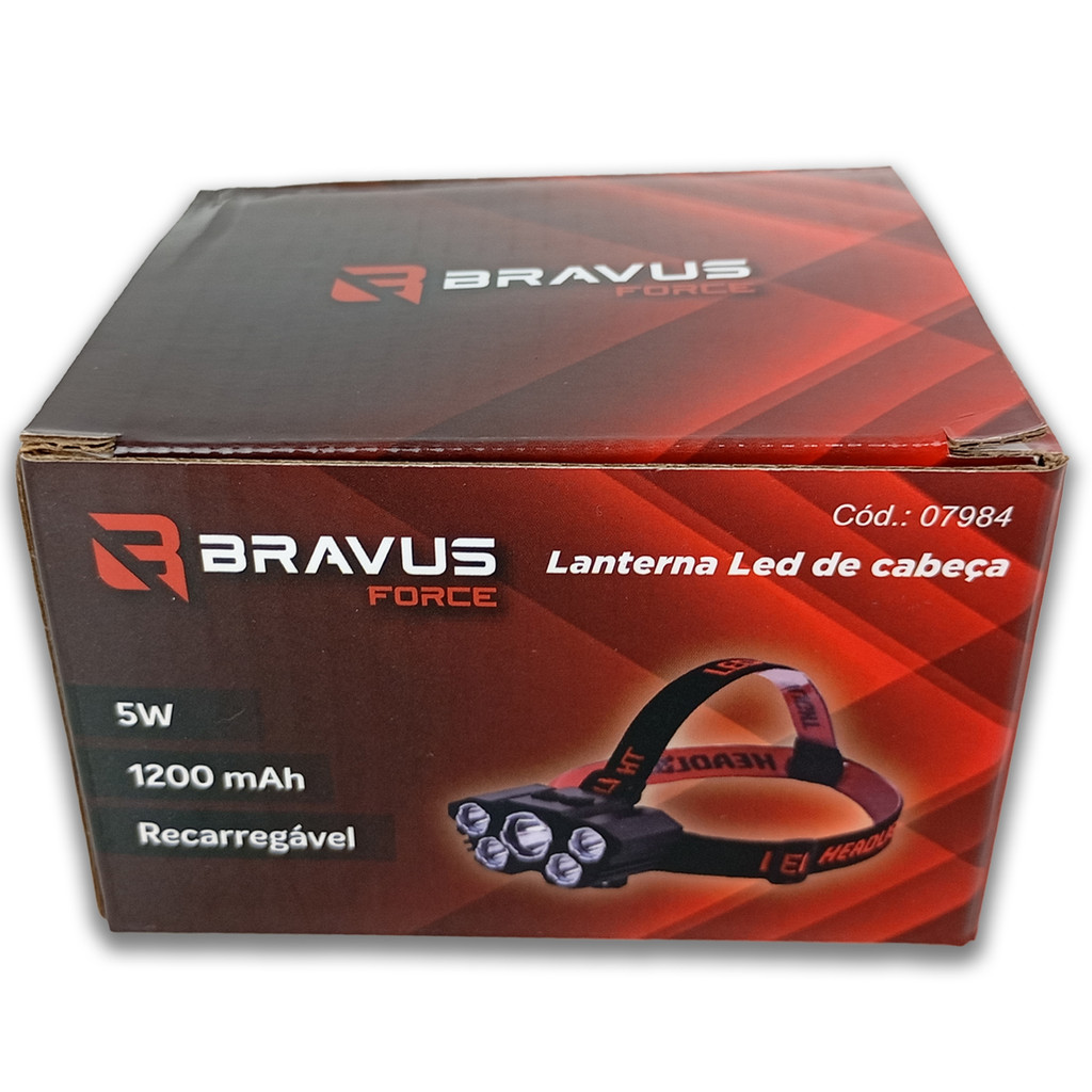Lanterna de Cabeça LED Recarregável 5W 1200mAh com 4 Modos de Luz USB - Bravus Force