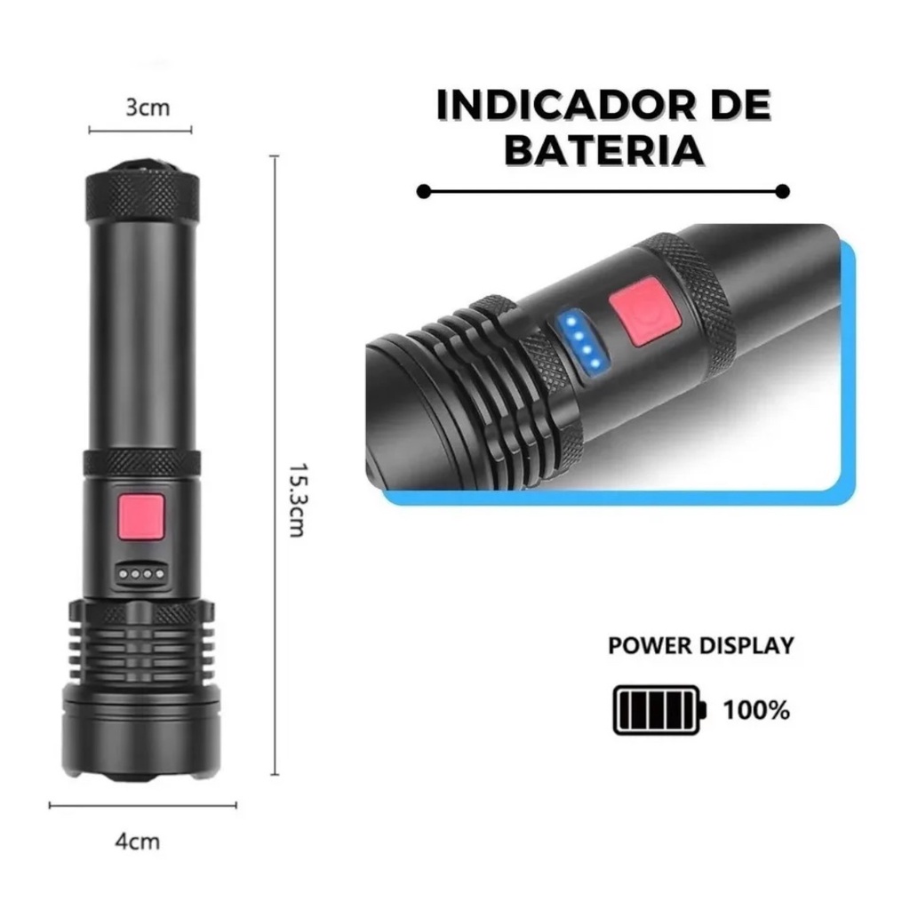 Dteam !!!!! Ferramenta indispensável para trilhas, escaladas, caminhadas, sobrevivência, pescaria, montanhismo, patrulha, policias, bombeiros, entre muitas outras atividades. Possui alto poder de brilho com menor consumo da bateria, que pode ser recarregada inúmeras vezes com o cabo USB incluso no kit que a acompanha ou em qualquer carregador de celular. A Lanterna Tática Militar LED P90 é composta por um dos Leds mais avançados do mundo, o Led T9 impressiona pelo alto poder de iluminação. É com certeza a lanterna mais forte da atualidade, você irá se impressionar. Ela também é perfeita para situações de emergência, defesa pessoal e atividades ao ar livre. BATERIA RECARREGAVEL VIA USB QUALIDADES DO PRODUTO: - LED: Utiliza LED XML T9 O MAIS FORTE DA ATUALIDADE - INDICADOR DE CARGA DA BATERIA: 4 LEDs que indicam o nível da bateria. - 5 MODOS DE FUNCIONAMENTO: - ZOOM: Novo Sistema de Foco regulável - 1 a 2000x vezes - LUZ: Utiliza LED T9 de quatro janelas super potente, com vida útil até 100.000 horas de uso. CARACTERÍSTICAS: - POTENCIA: Acima de 1800000W / 5400000 lumens SUPER FORTE - MATERIAL: Alta resistência em liga de alumínio, super resistente não se deforma. - ALIMENTAÇÃO: Bateria recarregável via USB COMO USAR: 1 - Carregar a bateria por no mínimo 12h (pode usar um carregador de celular ou somente com o cabo USB em qualquer porta USB) 2 - Pressionar o botão no meio da lanterna para ligar 3 - Pressionar o botão novamente vai alterar os modos de iluminação até que a lanterna desligue 4 - Nunca deixar a bateria esgotar totalmente, sempre carregar por 12h quando estiver indicando pouca bateria. Deixar esgotar pode perder a capacidade de carga e a garantia não irá cobrir. Sempre guardar a lanterna com a bateria carregada para preservar a sua capacidade de carga. CONTEÚDO DA EMBALAGEM: - MODELO 1: - 01 Lanterna Tática - 01 Cordão de punho - 01 Cabo USB para carregar a bateria