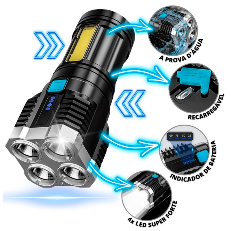 Obtenha a lanterna ideal para todas as suas necessidades. Feita com materiais resistentes e de qualidade, possui leds muito potentes, com 4 modos de luz e é recarregável. Ela se adapta a todas as situações em que você precise de uma boa iluminação. Super indicado para trilho, camping, passeio de bike, caça, pesca. ou em qualquer situação que requer um equipamento de luminosidade de alta potencia. Resistente à Agua e ao pó. Esta lanterna é resistente a situações climáticas adversas ou a derramamentos de água sobre o produto. Feita com materiais duráveis e de qualidade na sua composição, é uma ótima opção para ter em casa.