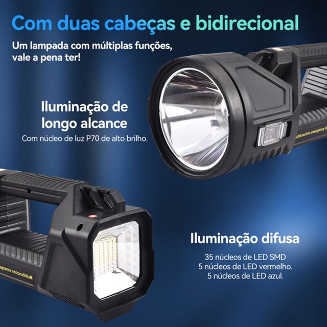 Lanterna Holofote Solar Pro Led Super Potente Recarregável com USB Luz Fria e Quente