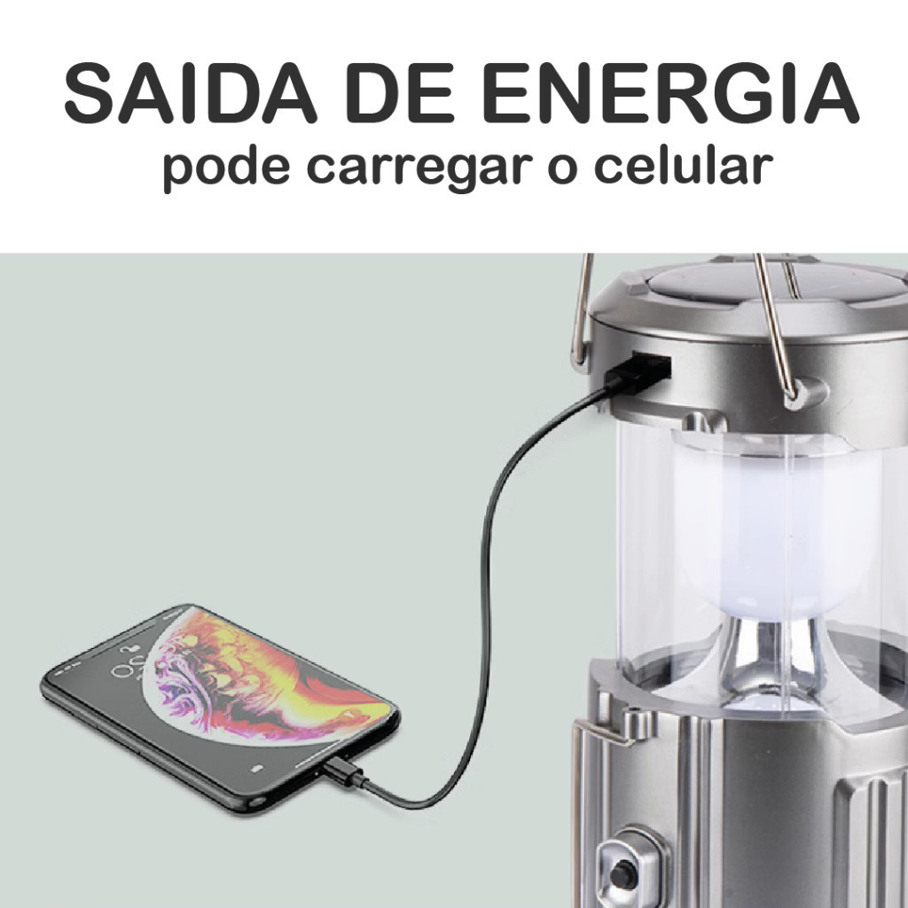 Modelo 1 - Dourado Lanterna 🔥 Lampião Recarregável Multiuso – Iluminação para seu Camping! ✨ Destaques do Produto: • 3 em 1: Iluminação LED, Lanterna e carregamento de dispositivos. • 3 Modos de Energia: Solar, USB 5V DC e 3 pilhas AA (não inclusas). • Portátil e Versátil: Pode ser pendurado ou apoiado em superfícies. • Bateria de Longa Duração: Dura de 6 a 12 horas com carga completa. • Leve e Compacto: Fácil de transportar, ideal para camping e emergências. 📌 Especificações Técnicas: • Peso: 328g • Cor: Dourado • Material: ABS + Metal • Voltagem: 5V • Fonte de Energia: Solar / USB / Pilhas • Pilhas Inclusas: Não • Tipo de Lâmpada: LED 🎒 O companheiro ideal para suas aventuras ao ar livre! 🌿🔥 Modelo 2 - Prata Ventilador 🔥 Lampião Recarregável Multiuso – Iluminação e Ventilação para seu Camping! ✨ Destaques do Produto: • 3 em 1: Iluminação LED, ventilador e carregamento de dispositivos. • 3 Modos de Energia: Solar, USB 5V DC e 3 pilhas AA (não inclusas). • Portátil e Versátil: Pode ser pendurado ou apoiado em superfícies. • Bateria de Longa Duração: Dura de 6 a 12 horas com carga completa. • Leve e Compacto: Fácil de transportar, ideal para camping e emergências. 📌 Especificações Técnicas: • Peso: 328g • Cor: Prata • Material: ABS + Metal • Voltagem: 5V • Fonte de Energia: Solar / USB / Pilhas • Pilhas Inclusas: Não • Tipo de Lâmpada: LED 🎒 O companheiro ideal para suas aventuras ao ar livre! 🌿🔥