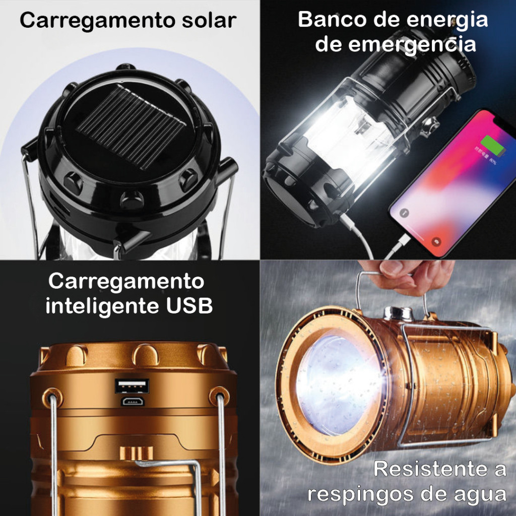 🔥 Lampião Recarregável Multiuso – Iluminação para seu Camping! ✨ Destaques do Produto: • 3 em 1: Iluminação LED, Lanterna e carregamento de dispositivos. • 3 Modos de Energia: Solar, USB 5V DC e 3 pilhas AA (não inclusas). • Portátil e Versátil: Pode ser pendurado ou apoiado em superfícies. • Bateria de Longa Duração: Dura de 6 a 12 horas com carga completa. • Leve e Compacto: Fácil de transportar, ideal para camping e emergências. 📌 Especificações Técnicas: • Peso: 328g • Cor: Dourado • Material: ABS + Metal • Voltagem: 5V • Fonte de Energia: Solar / USB / Pilhas • Pilhas Inclusas: Não • Tipo de Lâmpada: LED 🎒 O companheiro ideal para suas aventuras ao ar livre! 🌿🔥