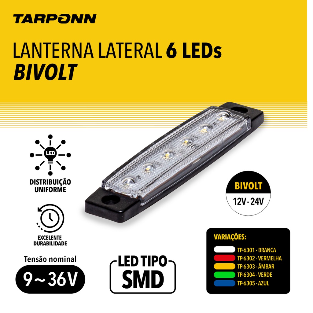 PRODUTO A PRONTA ENTREGA, COM ENVIO IMEDIATO E NOTA FISCAL! Procura por uma iluminação eficiente e durável? Com um alto brilho e distribuição uniforme da iluminação, a Lanterna Lateral da TARPONN é a escolha perfeita para quem busca uma iluminação de qualidade e durabilidade superiores. CARACTERÍSTICAS: · Alto Brilho · Alta Durabilidade · Distribuição Uniforme da Iluminação · Fácil de Adaptar · Baixo Consumo de Energia APLICAÇÃO: Porta-malas, Pisca auxiliar, Caminhões Baú, Trailer, Barcos, Baú, Carretas, Ônibus, Placa de licença entre muitas outras utilidades pois é pequena, discreta e com boa iluminação.. FICHA TÉCNICA: · Cor: Verde · Encaixe: Universal · Tensão: 12 a 24V · Equivalência: 3W · Tipo de LED: SMD · Linha: Standart · Grau de proteção de água: IP65 · Fluxo Luminoso: 5 lúmens CONTEÚDO EMBALAGEM: · 01 LANTERNA LATERAL 6 LEDs Mega GT - Especialista em Acessórios Automotivos e Utilidades Na Mega GT, somos especialistas em Acessórios Automotivos e Utilidades. Buscamos sempre oferecer a melhor opção com preço justo em todas as suas compras. Todos os produtos: • São Produtos Originais • Acompanham Nota Fiscal • Envio em Até 24 Horas • 3 Meses de Garantia DÚVIDAS FREQUENTES: • Os produtos são originais? Sim, todos os nossos produtos são originais e de alta qualidade. • Temos pronta entrega? Sim, todos os nossos produtos estão disponíveis em estoque para envio imediato. Despachamos em até 24 horas. • Emitem nota fiscal? Sim, todos os nossos produtos acompanham nota fiscal, garantindo a sua segurança e a conformidade nas transações comerciais. • Possui garantia? Sim, os nossos produtos Lanterna Lateral possuem garantia de 3 Meses. A sua satisfação é a nossa prioridade. *Imagens meramente ilustrativas