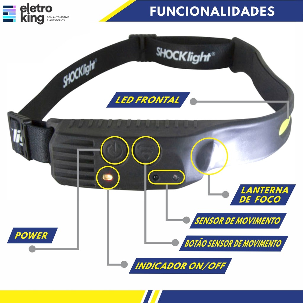 Lanterna Led Headlamp Shocklight de Cabeça - (SPL-1004) A Lanterna LED Headlamp combina potência, conforto e praticidade em um único equipamento. Com três modos de luz branca — suave para tarefas leves, forte para máxima visibilidade e piscante (strobe) para sinalização —, ela se adapta facilmente a qualquer situação. Seu sensor de movimento permite ligar e desligar a lanterna com um simples gesto, enquanto a cinta ajustável e o interior acolchoado garantem conforto mesmo durante longos períodos de uso. Resistente e funcional, é a escolha perfeita para aventuras ao ar livre, trabalhos noturnos ou situações de emergência. Especificações Técnicas: • Marca: SHOCKLIGHT • Modelo: SPL 1004 • Fonte de luz: LED COB • Fluxo luminoso: 300lm/150lm • Grau de proteção: IP44 • Bateria: Li-Ion 2400mAh • Tempo de operação contínua: 4 - 8 horas • Tempo de carregamento: 3 horas • Fixação: Na cabeça • Material: Plástico PP/ABS, policarbonato, borracha, fita elástica, componentes eletrônicos, bateria de Li-Ion. • Ângulo de luz: 60 graus Botão sensor • Ativa comandos por movimento Procedimento de carregamento: • Desligue a lanterna e conecte o cabo a porta USB; Após carregar a bateria, desconecte o cabo da lanterna. Funcionamento: • Luz 100% (pressionar botão por um tempo). • Luz 60% • Lanterna lateral (lanterna de foco). • Modo flash/strobo (pressionar botão por um tempo). Precauções: 1. Ao usar a lanterna, não direcione a luz para o olho humano para evitar ferimentos. 2. Ao usar o farol pela primeira vez, carregue-o totalmente antes de usá-lo. 3. Mantenha fora do alcance de crianças. Conteúdo da Embalagem: • 01 Lanterna Led Headlamp Shocklight de Cabeça • 01 Cabo USB-C Importante: • Garantia de 273 Dias / Bateria 90 Dias • Valor Unitário.