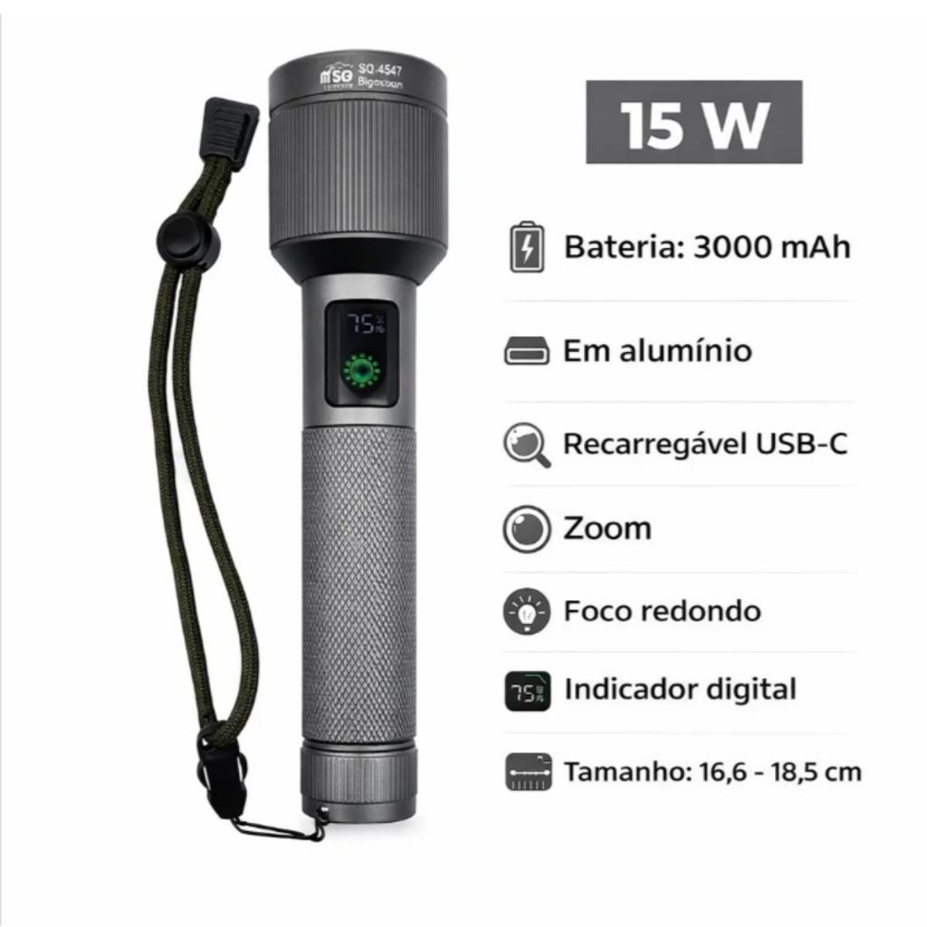 Lanterna T9 – A mais potente do mundo A Lanterna T9 é sinônimo de poder, resistência e tecnologia. Desenvolvida para quem exige máxima iluminação, ela entrega um facho de luz extremamente forte e de longo alcance, ideal para aventuras noturnas, trilhas, acampamentos, pescarias, segurança e uso profissional. Com design robusto e moderno, a T9 é construída em liga de alumínio aeronáutico, garantindo alta durabilidade e resistência a impactos e à água. Possui múltiplos modos de iluminação, desde luz intensa para grandes áreas até o modo econômico, que prolonga a bateria em longas jornadas. Equipada com bateria recarregável de longa duração, a Lanterna T9 é compacta, prática e fácil de transportar, unindo potência incomparável e eficiência em um só equipamento. Se você busca a lanterna mais forte, confiável e durável do mercado, a T9 é a escolha definitiva!