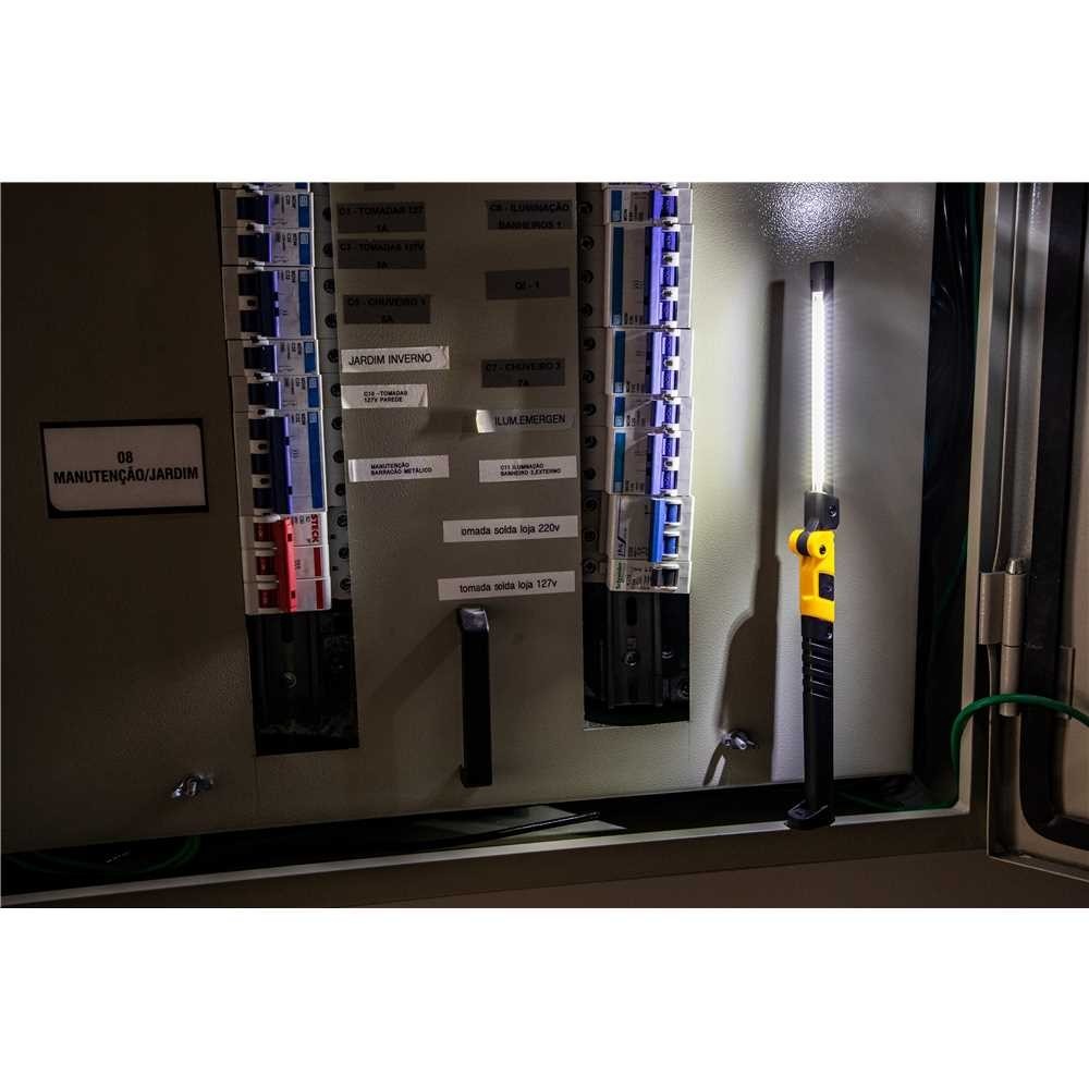 Lanterna recarregável dobrável LED, LRD 200, VONDER Lanterna dobrável, possui ajuste de níveis de luminosidade através de interruptor, adaptando-se de acordo com a necessidade do profissional, cabo emborrachado e base magnética, que proporciona facilidade e eficiência na utilização. Conta com LED indicador de nível da bateria. É resistente a quedas (IK07) e spray de água (IP54). Bateria recarregável 3,7 V 700 mAh - Lítio. .** Tecnologia LED COB, Chip On Board (chip integrado na placa), é uma tecnologia mais moderna e recente de iluminação. Seu principal diferencial é a melhora no desempenho, pois proporciona uma luz multidirecional. Ou seja, a luminosidade é igual em todos os pontos. Isso ocorre devido à capacidade de alojar nove ou mais LEDs dentro de um único agrupamento. O LED COB tem mais eficiência, já que trabalha apenas com dois contatos e um circuito. Ele costuma ter uma vida útil maior. Indicada para profissionais de mecânica, reparos industriais, profissionais de manutenção residencial e automotiva. Ao primeiro toque no botão liga/desliga lateral, o LED do topo (80 lúmens) se aciona; no segundo toque no botão, aciona-se o LED frontal (100 lúmens); no terceiro toque, o LED frontal aumenta sua luminosidade (200 lúmens); no quarto toque no botão, é acionado o LED traseiro (180 lúmens); e no quinto toque, a lanterna desligará. O LED indicador irá piscar na cor VERDE durante o carregamento. Quando a bateria estiver com a carga carregada, o LED ficará aceso continuamente na cor VERDE informando carga completa. Temperatura da cor: 6.500 K. Modelo: LRD 200 Material da lanterna: Plástico e borracha Cor da lanterna: Amarela e preta Fluxo luminoso (lm): 80 lm (Led topo) / 100 lm baixa - 200 lm alta (Led frontal) / 180 lm (Led traseiro) Tipo do LED: COB Quantidade de LEDs da lanterna: 3 (1 topo SMD, 1 frontal COB e 1 traseiro COB) Tipo de lâmpada: Led Diâmetro da lente da lanterna: 4,0 mm (topo) Comprimento total da lanterna: 306,0 mm (aberta) Tempo de carga: Aproximadamente 2 horas e 30 minutos Alimentação da lanterna: Recarregável Bateria: 3,7 V 700 mAh - Íons de Lítio Entrada de carregamento: USB Tipo C Tensão (V): Carregamento via cabo USB tipo C (não acompanha plugue) Massa aproximada (peso) (kg): 0,183 kg Conteúdo da Embalagem: 1 Lanterna recarregável. Acompanha: 1 cabo para carregamento USB tipo C.