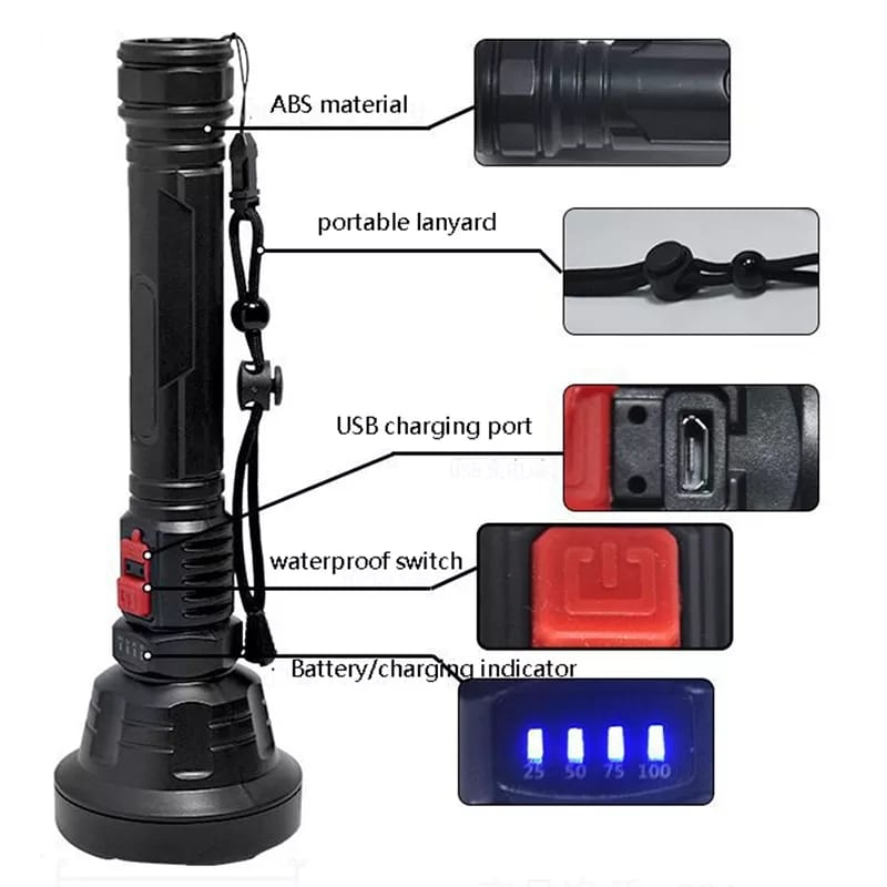 Características: 1. peso leve, fácil acessível. 2. esta lanterna é resistente e durável o suficiente para uso diário longo tempo. Especificação: Modo: alto, baixo, estroboscópio Potência: bateria de lítio embutida Escala: 500m Cor da luz: branco brilhante Cor: preto Tamanho: 26cmx8cm Carregamento: sim Design antiderrapante: sim Tempo de iluminação: 2 horas Interruptor: lanterna metale Lista de embalagem: 1 x lanterna elétrica 1 x cabo usb