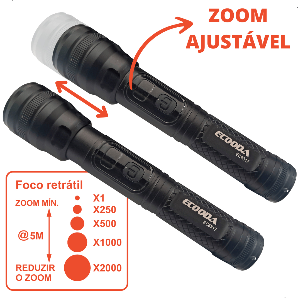 Lanterna Tática Led Recarregável W100 Super Potente Com Zoom - Ecooda Lanterna Tática LED Recarregável W100 Ecooda EC6317. Potente, resistente e versátil, ideal para camping, trilhas, pesca, caça e segurança pessoal. Possui LED W100 de alta luminosidade, com até 10.000 lúmens, ajuste de foco telescópico de 1x a 2000x e estrutura em alumínio aeronáutico com pintura eletrostática para maior durabilidade. Resistente à água (chuvas e respingos) e a quedas, com vida útil de até 10.000 horas. Sistema eletrônico com 3 modos de luz: forte, média e strobo, bateria recarregável via USB tipo C, indicador de carga e foco preciso com feixe redondo mesmo em longas distâncias. Compacta, leve e eficiente, ideal para qualquer situação que exija iluminação potente. Especificações: Modelo: Ecooda EC6317 LED W100, até 10.000 lúmens Modos de luz: forte, média, strobo Foco telescópico 1x a 2000x Resistente à água e quedas Bateria recarregável USB tipo C, indicador de carga Autonomia: até 12 horas