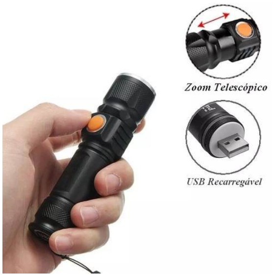Indicada para Caça , camping , Pesca , Trilhas , cilismo , esportes em geral , Bombeiros , Vigias , Vigilante , Abordagem e uso diário Led T6 de alta potência com uma vida útil de até 100.000 horas Pode ser Recarregada em qualquer saída USB de computadores , tomadas , som , e ate mesmo no Power Bank além de outras Possui 3 modos de operação do Led Luz alta 100% de capacidade Luz baixa 50% de capacidade Strobo ( S.O.S pedido de Emergência ) Sinalização Possui Bateria Interna de Lítio interna Botão Lateral Prova de explosão Metal alta intensidade Foco com Zoom de 1 x 2000 deslizante Medidas da lanterna 11cm x 2,2 cm Irradiação na distância de até 200 metros Visibilidade de aprox; 500 metros Itens inclusos 1 Mini Lanterna tática de led T6 USB 1 Caixa Original do produto