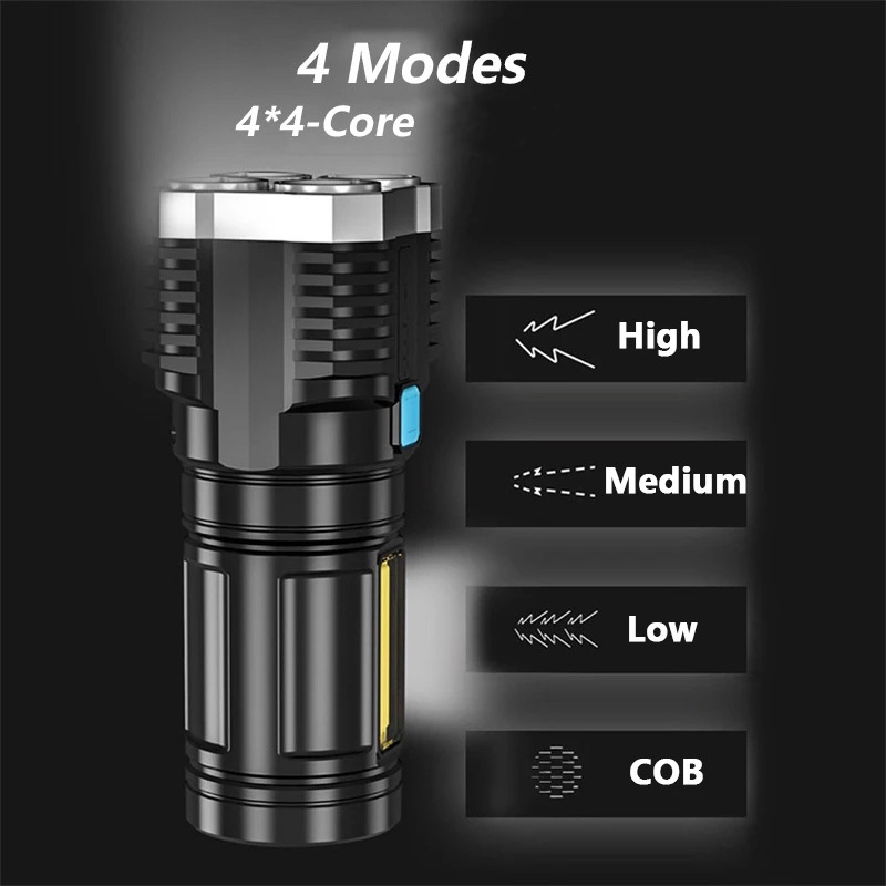 Completa, potente e duradoura essa lanterna lhe auxiliara nas mais diversas atividades como camping, pesca, concertos no escuro e mais. Esta lanterna conta com 4 potentes leds principais e um led COB lateral, contando com 4 modos de iluminacao, indicador de bateria e bateria recarregavel!! ITENS INCLUSOS: - 1 Lanterna 4 Leds - 1 Cabo Micro USB ESPECIFICAÇÕES DO PRODUTO: – Peso do produto: 133g – Capacidade da bateria:1200 mAh Por favor, certifique-se de que seu endereço e cep estão corretos antes de fazer um pedido.