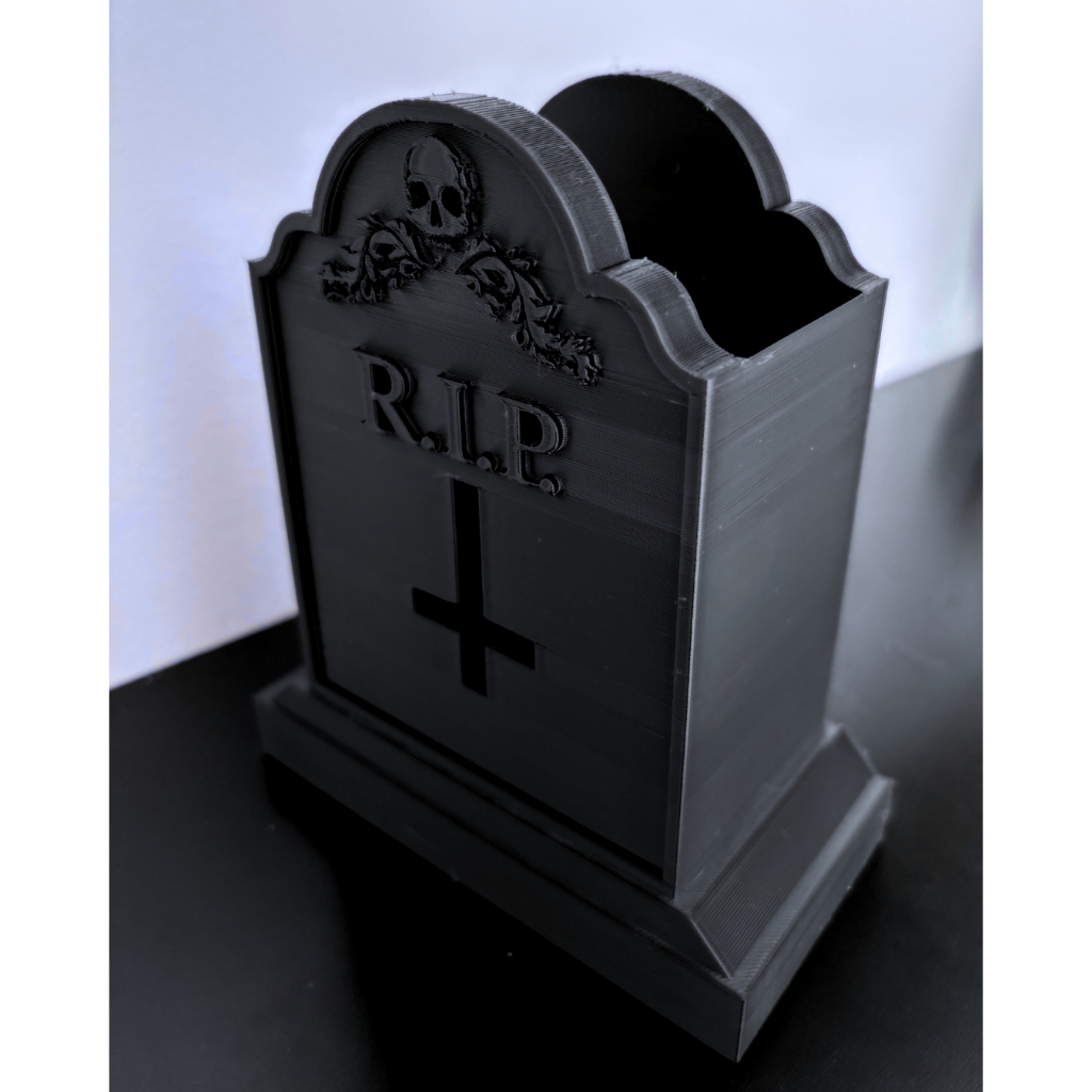 💀✨ Porta-Pincéis e Canetas em Formato de Lápide – 3D Print ✨💀 Deixe sua penteadeira ou mesa de trabalho com um toque obscuro e estiloso - ou simplesmente use como decoração de Halloween! Este porta-pincéis/canetas em formato de lápide é ideal para quem ama decoração dark, temática de Halloween ou quer um acessório criativo para organizar seus itens. 🖤 Destaques do produto: Design exclusivo em formato de lápide com detalhes em relevo (caveira e ornamentos) Perfeito para organizar pincéis de maquiagem, canetas, lápis ou ferramentas pequenas Produzido em impressão 3D com PLA Resistente, leve e cheio de personalidade Ótima opção de presente criativo e decorativo ✨ Dimensões aproximadas: 129x64x151mm