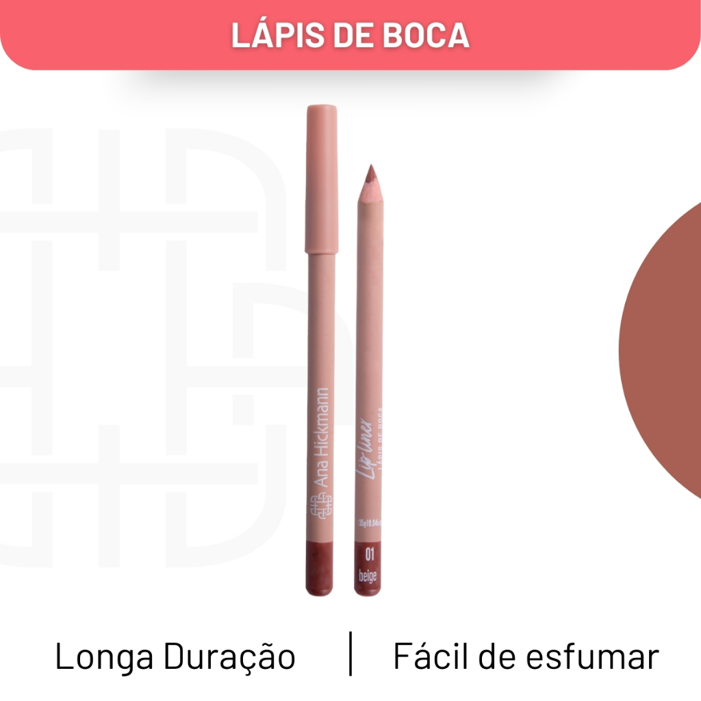 Sinta-se poderosa e confiante com a linha de maquiagens de Ana Hickmann. Produtos para rosto, olhos, boca e acessórios como esponjas, curvex, pincéis profissionais e kits. Produtos de alta performance. Seja a protagonista do seu próprio beauty show! - Lápis de boca com fórmula enriquecida com mix de óleo naturais (coco, carnaúba e rícino). - Desliza com facilidade e é fácil de esfumar. - Pode ser apontado. - Disponível em 4 cores. Modo de uso: Passe contornando os lábios e depois esfume levemente com ajuda de um pincel ou com o dedo.Ingredientes: Ceresin, Ricinus Communis Seed Oil, Hydrogenated Coconut Oil, Caprylic/Capric Glycerides, Copernicia Cerifera Wax (Carnauba), Bis-Diglyceryl Polyacyladipate-2, Phenoxyethanol. May Contain: Titanium Dioxide (CI 77891), Pigment Red 57 (CI 15850), Iron Oxide Red (CI 77491), Iron Oxide Yellow (CI 77492), Iron Oxide Black (CI 77499), Mica (CI 77019), Curry Red (CI 16035). * Produto Vagano *