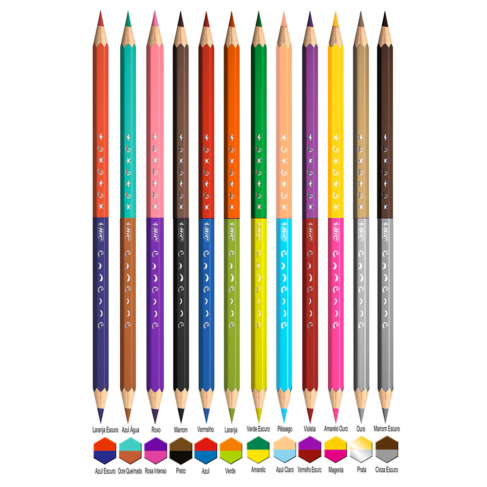 INMETRO 003732/2012 Cores em dobro, criatividade em dobro! O Lápis de Cor Bicolor da BIC é um produto inteligente que oferece 2 cores intensas por lápis, assim, não é necessário ter uma quantidade grande de lápis de cor. O produto vem com um Apontador grátis. Possui o formato sextavado, que traz mais conforto no manuseio e evita que o lápis role pela mesa. É um produto atóxico, portanto seguro para crianças. Solte sua imaginação com os Lápis Bicolor da BIC! Detalhes: - Mais praticidade e economia - Duas cores por lápis: 12 unidades = 24 cores vibrantes - Produto atóxico: seguro para crianças - Mina macia e fácil de apontar - Grátis 1 apontador
