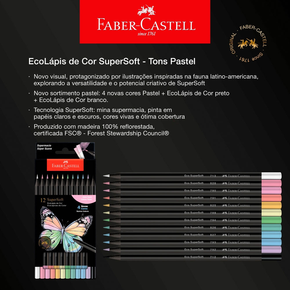 A família SuperSoft está de cara nova! Novo sortimento pastel para suas criações terem mais cores incríveis: 4 novas cores pastel + Ecolápis de cor preto + Ecolápis de cor branco. Visual protagonizado por ilustrações inspiradas na fauna latinoamericana, explorando a versatilidade e a criatividade artística. Com mina super macia, cores mais vivas e excelente cobertura, pinta papéis claros e escuros. Selo de originalidade mostrando o pioneirismo e design exclusivo Faber-Castell. Produzido com madeira 100% reflorestada, certificada FSC® - Forest Stewardship Council. Detalhes: - Novo sortimento 12 cores Pastel com adição do Ecolápis de cor branco - Cores mais vivas e excelente cobertura - Nova identidade valorizando a fauna latinoamericana - Mina super macia - Pinta papéis claros e escuros