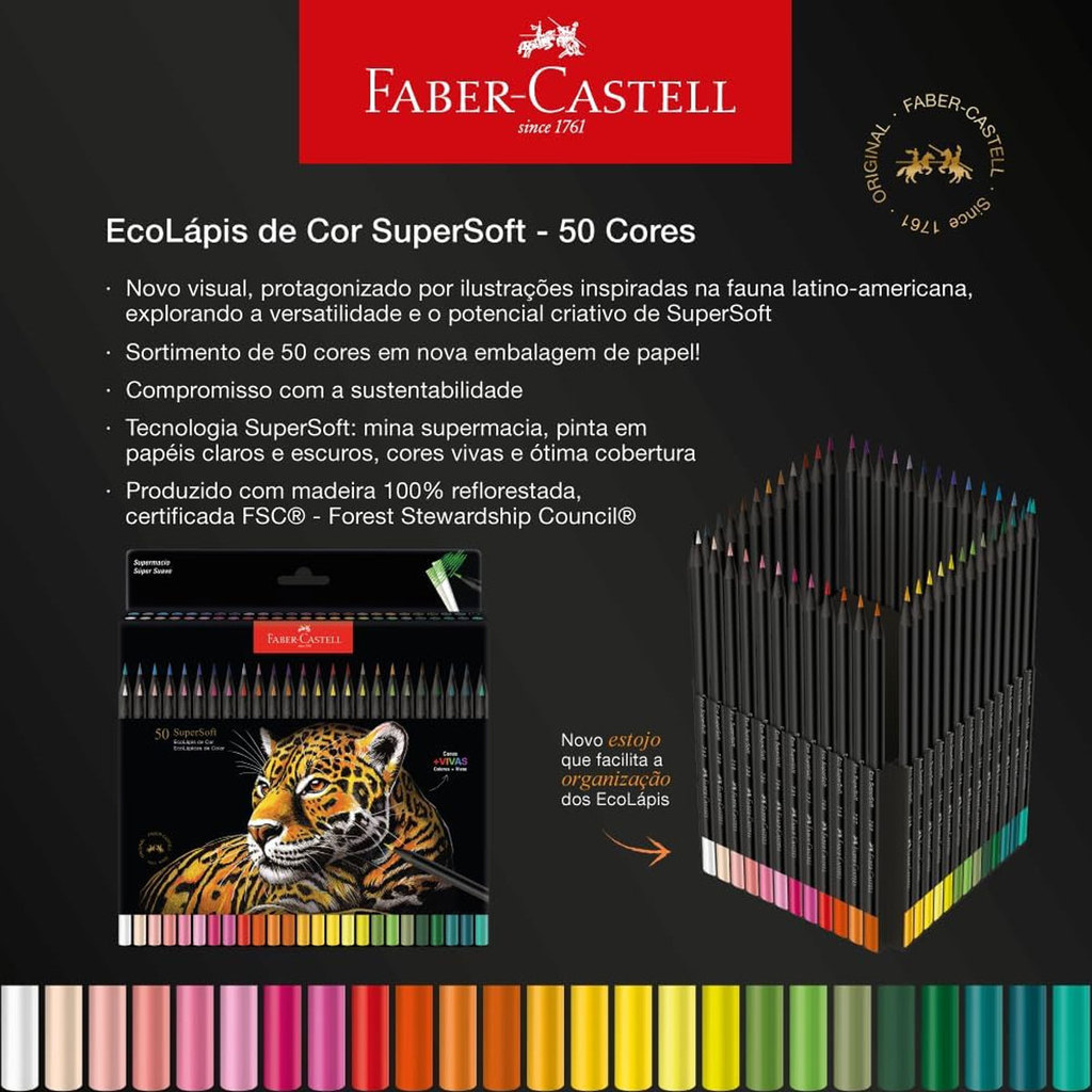 A família SuperSoft está de cara nova! Novo visual protagonizado por ilustrações inspiradas na fauna latinoamericana, explorando a versatilidade e a criatividade artística. Compromisso com a sustentabilidade: retirada de embalagens plásticas. Com mina super macia, cores mais vivas e excelente cobertura, pinta papéis claros e escuros. Selo de originalidade mostrando o pioneirismo e design exclusivo Faber-Castell. Produzido com madeira 100% reflorestada, certificada FSC® - Forest Stewardship Council®. Detalhes: - Estojo com 50 cores - Cores mais vivas - Cobertura extrema - Mina super macia. - Pinta papéis claros e escuros. - Produzido com madeira 100% reflorestada, certificada FSC® - Forest Stewardship Council®. - Compromisso com a sustentabilidade: alteração da embalagem plástica para cartão.