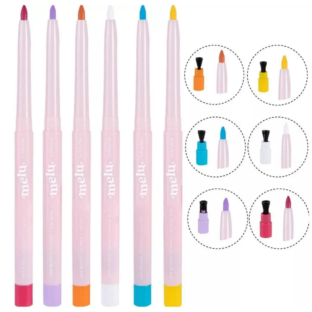 RR2056 LÁPIS RETRATIL COLORIDO Chegou a novidade mais esperada da melu, SIM! O lápis retrátil colorido que vem em 5 cores super pigmentadas. Com alta durabilidade e uma super textura macia. Esse novo HIT possui fórmula emoliente e resistente a água, sua ponta super fininha promete aquele traço super preciso, criando vários efeitos maravilhosos. Ele conta com apontador embutido tornando muito mais prático. POR QUE VOCÊ VAI AMAR? • Apontador embutido • Resistente a água • Alta pigmentação e Fixação •Fácil aplicação MODO DE USO: Gire a base para a direita até expor a mina. Faça um traço acompanhando a linha dos olhos. Aplique levemente para encontrar o tom desejado.