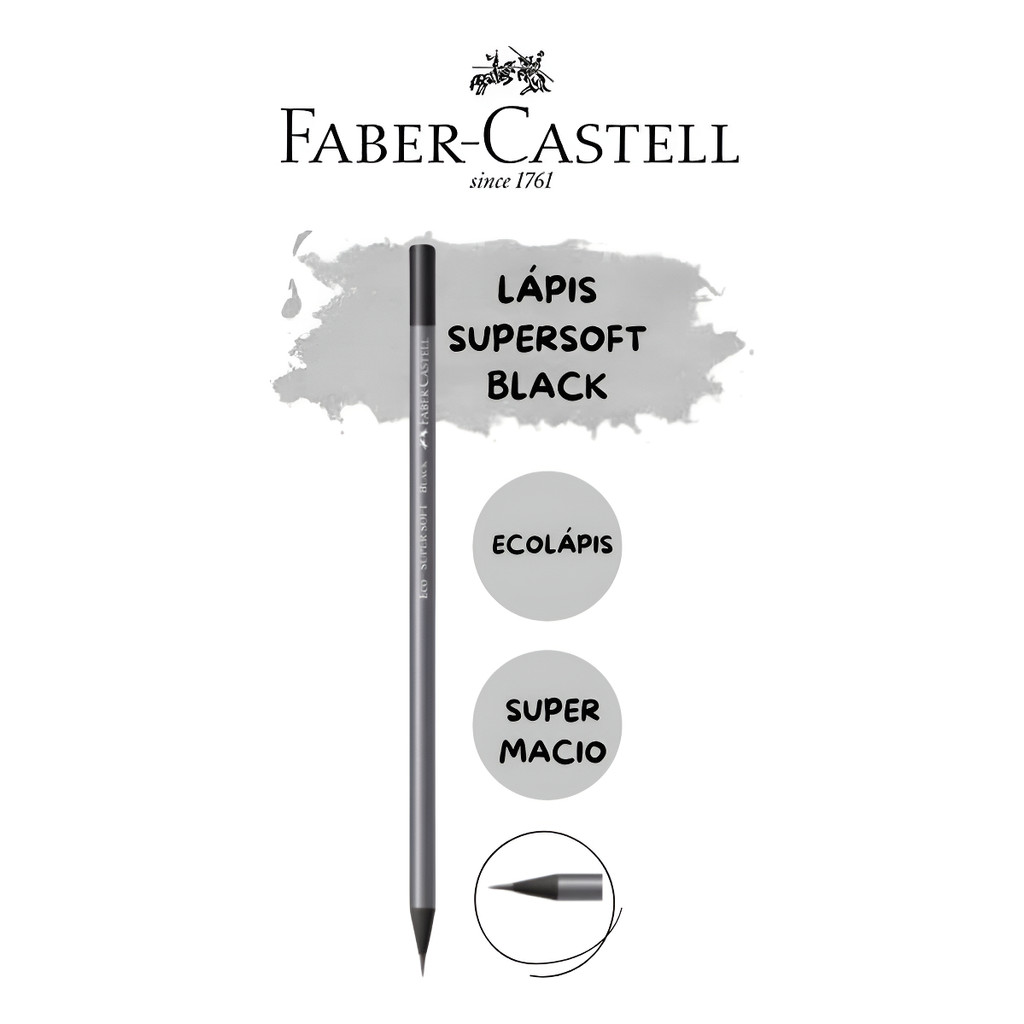 Lápis Grafite Supersoft Black Faber-Castell Ecolápis Grafite Faber-Castell SuperSoft traz a exclusiva tecnologia de mina super macia, a elegância da linha SuperSoft e a responsabilidade social da Faber-Castell com material e embalagem sustentáveis. Adequado para os mais diversos públicos. Produzido com madeira 100% reflorestada. DESCRIÇÃO: VENDA UNITÁRIA 1 UNIDADE GARANTA JÁ A SUA COMPRA. DISPONÍVEL EM: UNITÁRIO KIT COM 4 KIT COM 8