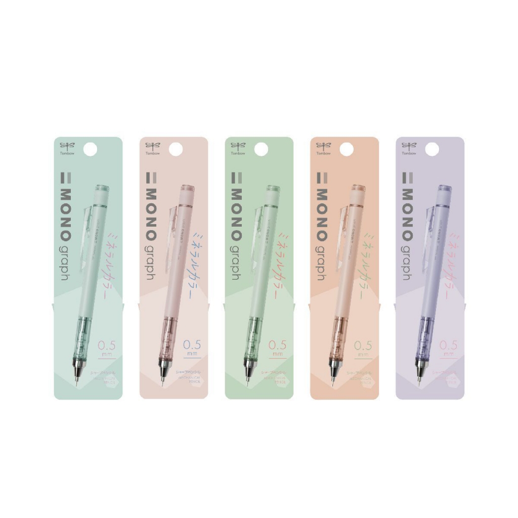 Fabricado no Japão Lápis Mecânico Gráfico Tombow 0,5MM Cor Mineral 0,5 mm Lápis mecânico com tipo de torção "MONO Eraser" anexado na parte superior. O "mecanismo de agitação", que avança o chumbo tremendo o lápis para frente e para trás, e o "trava de agitação" habilitado para cima empurrando o clipe, para evitar avanço de chumbo intencional quando armazenado.