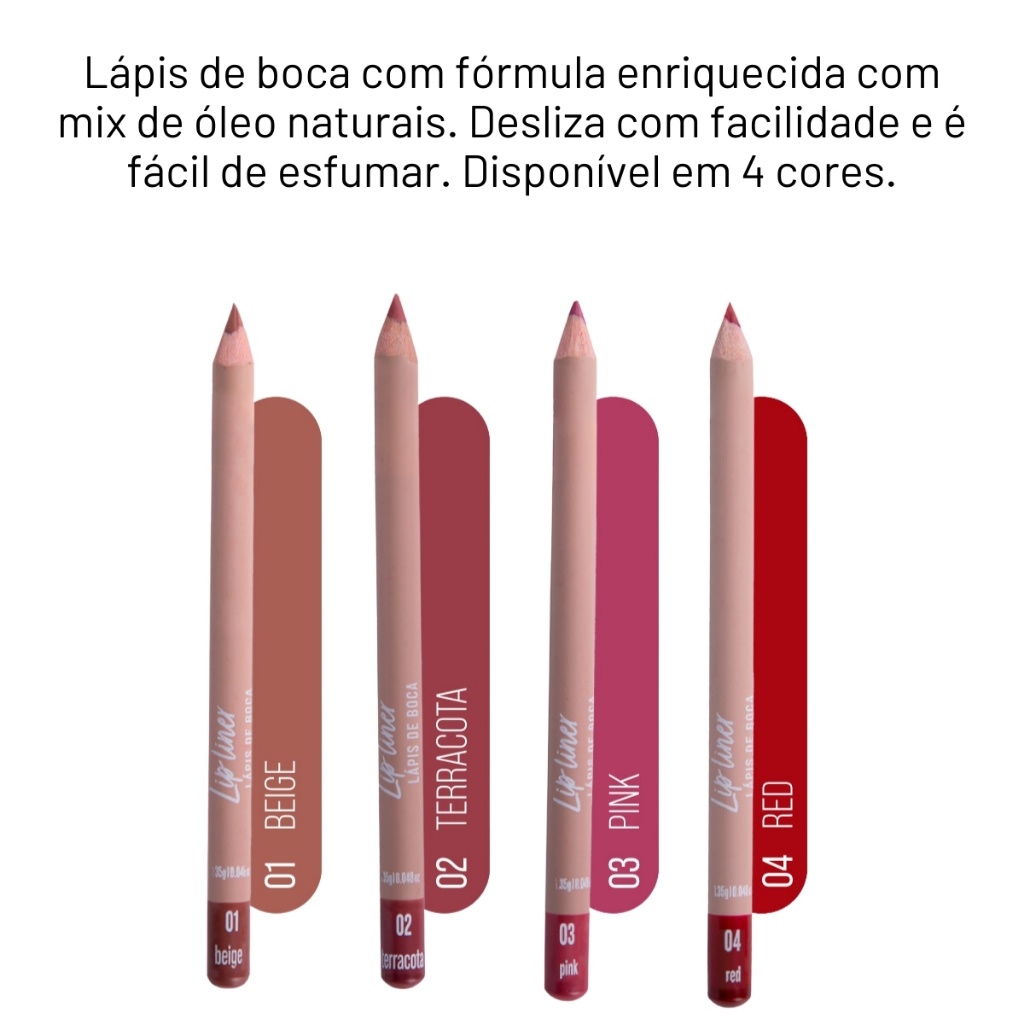 Sinta-se poderosa e confiante com a linha de maquiagens de Ana Hickmann. Produtos para rosto, olhos, boca e acessórios como esponjas, curvex, pincéis profissionais e kits. Produtos de alta performance. Seja a protagonista do seu próprio beauty show! Lápis de boca com fórmula enriquecida com mix de óleo naturais (coco, carnaúba e rícino). Desliza com facilidade e é fácil de esfumar. Pode ser apontado. Disponível em 4 cores. Modo de uso: Passe contornando os lábios e depois esfume levemente com ajuda de um pincel ou com o dedo. Ingredientes: Ceresin, Ricinus Communis Seed Oil, Hydrogenated Coconut Oil, Caprylic/Capric Glycerides, Copernicia Cerifera Wax (Carnauba), Bis-Diglyceryl Polyacyladipate-2, Phenoxyethanol. May Contain: Titanium Dioxide (CI 77891), Pigment Red 57 (CI 15850), Iron Oxide Red (CI 77491), Iron Oxide Yellow (CI 77492), Iron Oxide Black (CI 77499), Mica (CI 77019), Curry Red (CI 16035). * Produto Vegano *