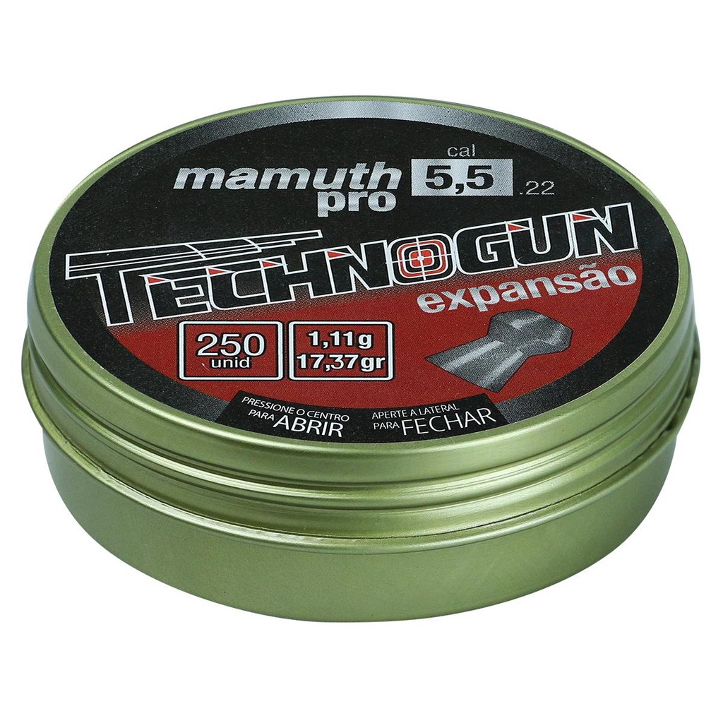 Produto de uso exclusivo em práticas esportivas. O uso do produto exige treinamento e equilíbrio emocional. Deverá ser guardado em lugar seguro e fora do alcance de terceiros. Os produtos aqui listados servem apenas para uso recreativo, ou seja ***NÃO*** letal. A TECHNOGUN é uma marca já muito famosa no mundo do Tiro Esportivo, reconhecida por ser uma das maiores fabricantes de munição no Brasil. Seus chumbinhos são formados por um exclusivo sistema de injeção em alta pressão, permitindo um balanceamento centrífugo gerando mais uniformidade e precisão. Outra informação importante é que a liga utilizada pela marca nos projéteis é formada predominantemente por chumbo(98%), zinco e outros metais! Oferecendo a dureza necessária para atender as mais exigentes armas nacionais e importadas. O Chumbinho Technogun modelo Mamuth Pro Expansão foi desenvolvido para desempenhar um enorme poder de destruição. Inspirado no modelo Hallow Point ou ""Ponta oca"", possibilita uma grande expansão de sua cabeça causando maior impacto. Por ter uma gramatura mais pesada é indicado para Carabinas de alta potência. ESPECIFICAÇÕES TÉCNICAS: - Marca: Technogun - Calibre: 5.5mm (.22) - Modelo: Mamuth Pro Expansão - Material: Chumbo - Quantidade: 250 unidades - Peso: 1,11 gramas - Gramatura: 17,37 grains - Comprimento: 7,8mm ITENS INCLUSOS: - 01 Lata de Chumbinho Technogun Mamuth Pro Expansão Calibre 5.5mm 250un. Observação: Garantia de 03 meses mediante defeitos de fábrica. INFORMAÇÃO: Os equipamentos, peças e acessórios aqui listados são de uso exclusivo em armas de pressão (gás comprimido ou mola), airsoft, paintball, esferas plásticas (BBS) e estão em conformidade com a legislação brasileira de USO PERMITIDO "É permitido o uso de armas de pressão por ação de gás comprimido ou por ação de mola, com calibre igual ou inferior a seis milímetros (6mm ou 6.0mm), e das que lançam esferas de plástico com tinta, como os lançadores de paintball." Conforme parágrafo único do Art. 11 do DECRETO Nº 11.615, DE 21 DE JULHO DE 2023. A venda desses itens é feita somente para maiores de 18 anos mediante a comprovação de maior idade. Atenção: O envio de Armas de pressão e Airsoft é realizado somente por transportadora. Caso tenham dúvidas entrar em contato.