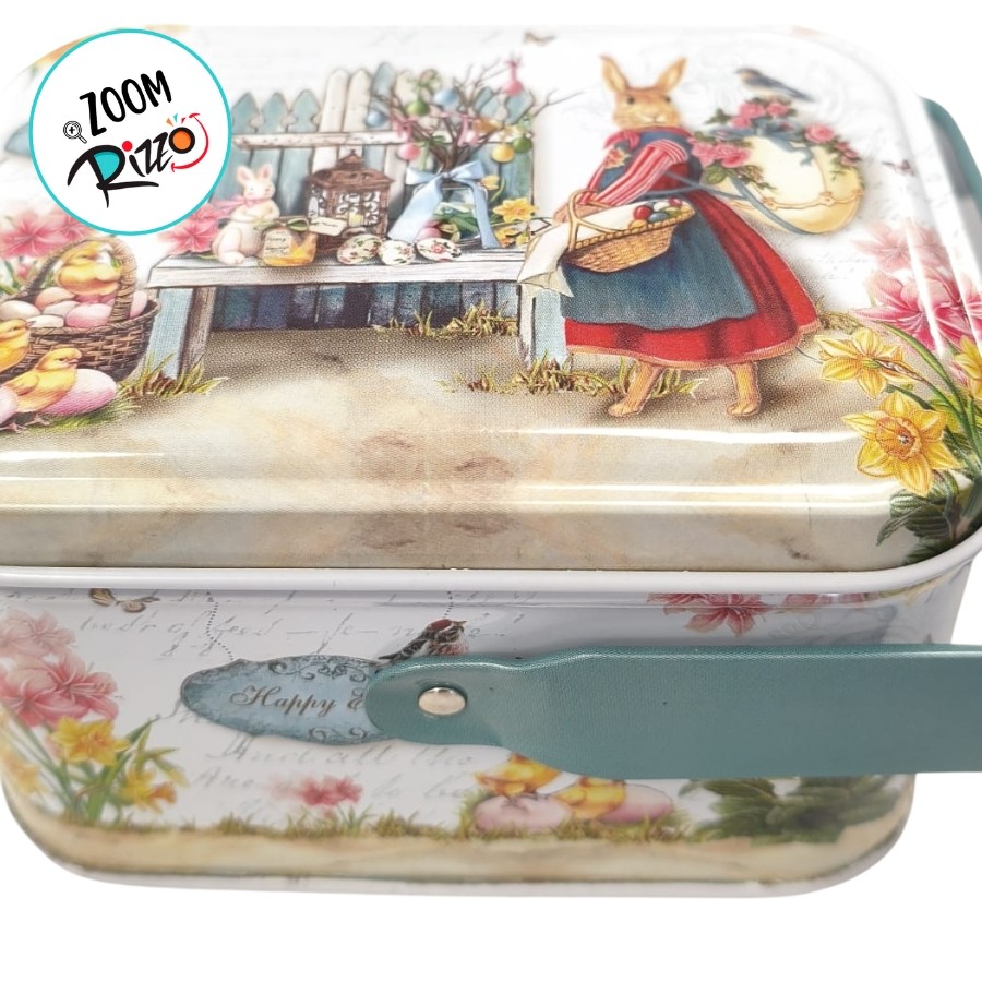 Lata de Metal Retangular com Alça de Páscoa - Coelha de Vestido Vermelho - 10,5x8x6cm - 1 unidade - Rizzo