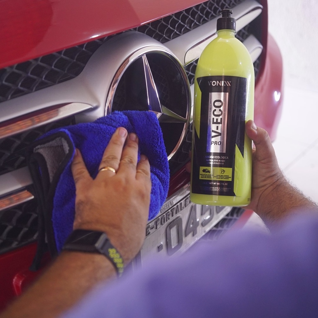 V-ECO PRO 1,5L - LAVA A SECO CONCENTRADO DESCRIÇÃO: Em sua composição utilizamos tensoativos, solventes ecológicos e ceras especiais como a carnaúba. Os tensoativos especiais ajudam na limpeza, baixando a tensão superficial, ajudando no desprendimento da sujeira na peça. Os solventes ecológicos são responsáveis pela solubilização de parte dessa sujeira, facilitando a limpeza. Já a cera de carnaúba, diminui o coeficiente de atrito reduzindo as chances de riscos e, ao mesmo tempo promove proteção e brilho. Se considerarmos o uso de 300 ml do produto por carro, na diluição 1:50, que seria uma limpeza leve, o rendimento é de até 250 veículos de porte pequeno com uma única garrafa de 1,5 L de produto. DILUIÇÃO: Pesada Diluição – 1:15 (superfície com barro ou lama) Convencional Diluição – 1:30 (sujeira convencional com excesso de pó e marcas de lama leve) Leve e Manutenção – 1:50 (poeiras diversas) MODO DE USO: 1. Dilua o produto de acordo com o nível de sujeira e adicione-o em um pulverizador 2. Agite bem o produto antes de usar 3. Pulverize o produto em uma área não superior a 60cm x 60cm e em seguida remova a sujeira com uma toalha ou pano, com movimentos laterais e virando-a frequentemente 4. Reaplique o produto na mesma superfície em uma quantidade menor e faça o acabamento final com outra microfibra limpa e seca, virando-a frequentemente até obter o brilho desejado 5. Em caso de manchas repita o procedimento