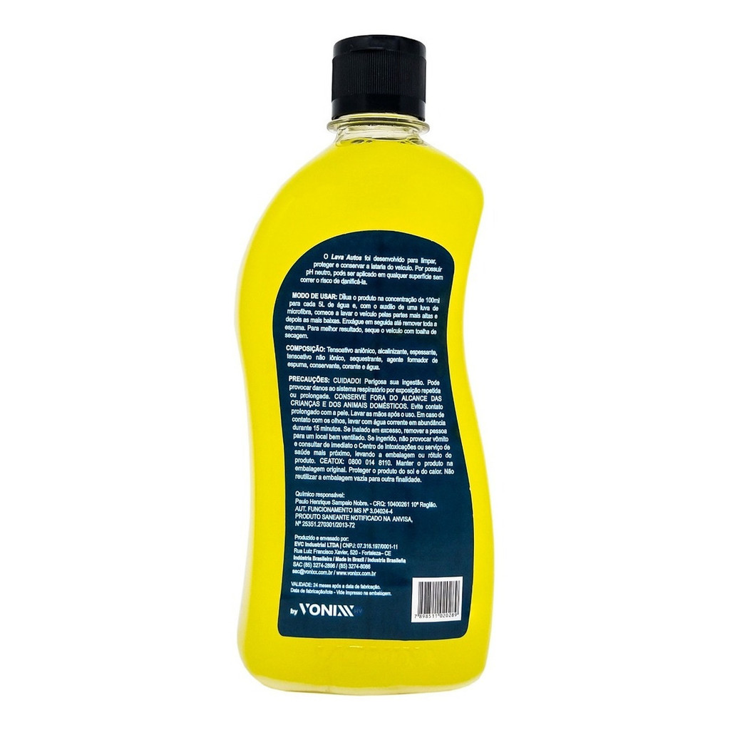 Lava Auto Shampoo Concentrado Ph Neutro 500ml Vintex Vonixx - 2010016 O LAVA AUTOS VONIXX é um produto que foi desenvolvido para limpar, proteger e conservar a lataria do veículo. Por possuir pH neutro, pode ser aplicado em qualquer superfície sem correr o risco de danificá-la. CARACTERÍSTICAS - Possui ótimo rendimento (Cada 1 litro do produto dilui em 40 litros de água); - Possui pH Neutro; - Pode ser aplicado em qualquer superfície; - Não danifica as superfícies onde é aplicado; MODO DE USAR: 1 - Dilua o produto na concentração de 100ml para cada 5L de água e, com o auxílio de uma luva de microfibra, comece a lavar o veículo pelas partes mais altas e depois as mais baixas; 2 - Enxágue em seguida até remover toda a espuma; 3 - Para melhor resultado, seque o veículo com toalha de secagem. Quantidade: 500ml. Imagens Meramente Ilustrativas