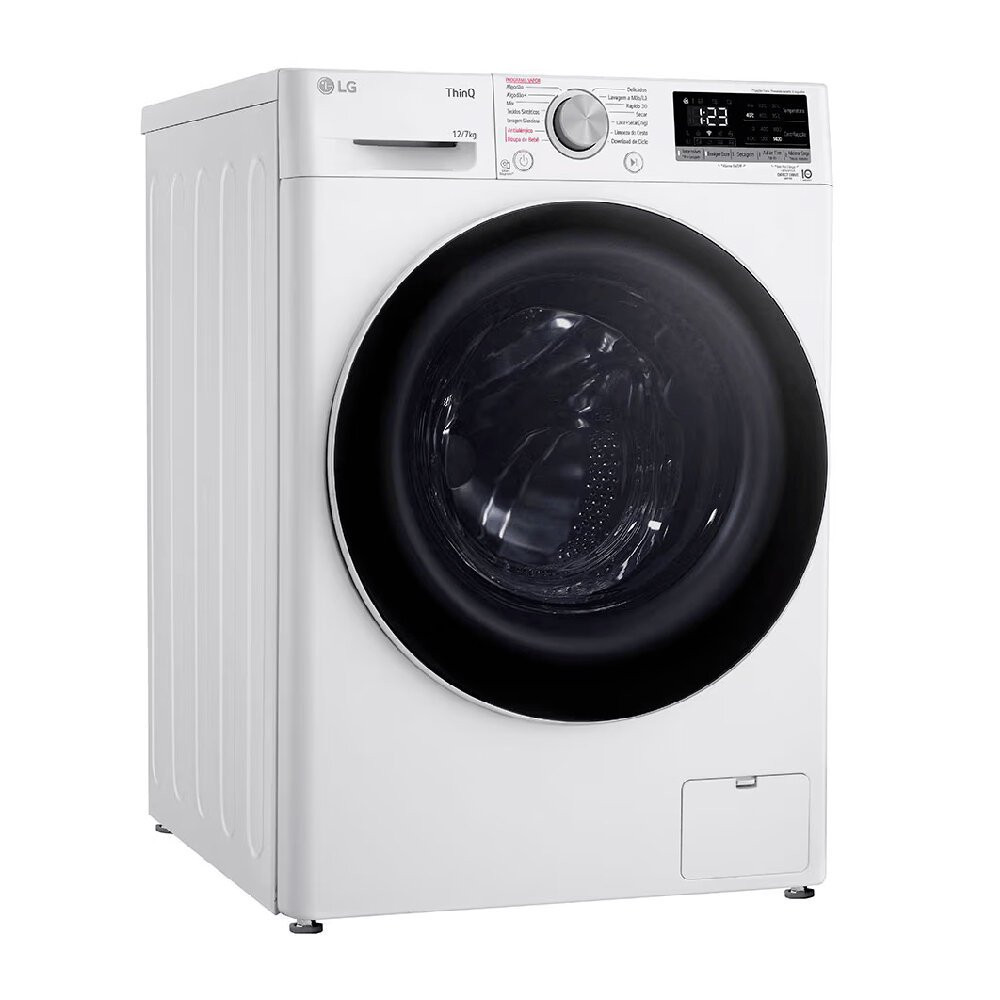 A Lava e Seca LG Smart VC4 12 kg com Inteligência Artificial AIDD CV5012WCA é a sua aliada na hora de lavar e secar as roupas. O produto conta com espaço suficiente para lavar itens maiores e volumosos. A Inteligência Artificial AIDD protege 18 mais as suas roupas durante a lavagem. Seu ciclo com Vapor elimina 99,9 dos alérgenos durante o ciclo. Além disso, a Lava e seca possui um sensor que pesa a quantidade de roupa e calcula o quanto de água será necessária para a lavagem. Com a conexão Wi-fi e comando de voz pelo Google Assistente, com o aplicativo LG ThinQ, você fica sempre de olho na lavagem das suas roupas. Com o Ciclo TurboWash, os ciclos são rápidos e tem 30 minutos de duração. Não perca essa oportunidade e garanta já a sua! Características: Marca: LG Modelo: CV5012WC4 Tipo: Lava e Seca Front Load Capacidade de lavagem: 12 kg Capacidade de secagem: 7 kg Níveis de água: Automático Temperatura da água: Frio/20/30/40/60/95ºC TurboWash: Sim Wi-Fi: Sim Função Adiar Fim: Sim Lava edredons: Sim Pés: Niveladores Motor: Direct Drive Consumo de água: 110V: 63,7 l/ciclo | 220V: 65,8 l/ciclo litros Consumo de energia: 0,23 kWh/ciclo Classificação Energética: A Ciclo rápido: 30 minutos Função Antiamassado: Não Porta: Tampa em vidro temperado preto fumê Certificação Inmetro: 003187/2023 Alimentação: Apenas água fria ThinQ Wi-Fi: Sim Adicionar roupas: Sim AI - Inteligência Artificial: Sim Sinal de fim de ciclo: Sim Tipo de tela: Mostrador + LED Touch Sensor de Vibração: Sim Lavar com Vapor: Sim Indicação de trava na porta: Sim LoadSense: Sim Reinício Automático: Sim Função pré lavagem: Sim Temporizador de adiamento: 3-19 horas Dimensões: Altura: 85 cm Largura: 60 cm Profundidade: 56 cm Peso: 73 kg Garantia do Fabricante: 12 meses do produto e 10 anos do motor